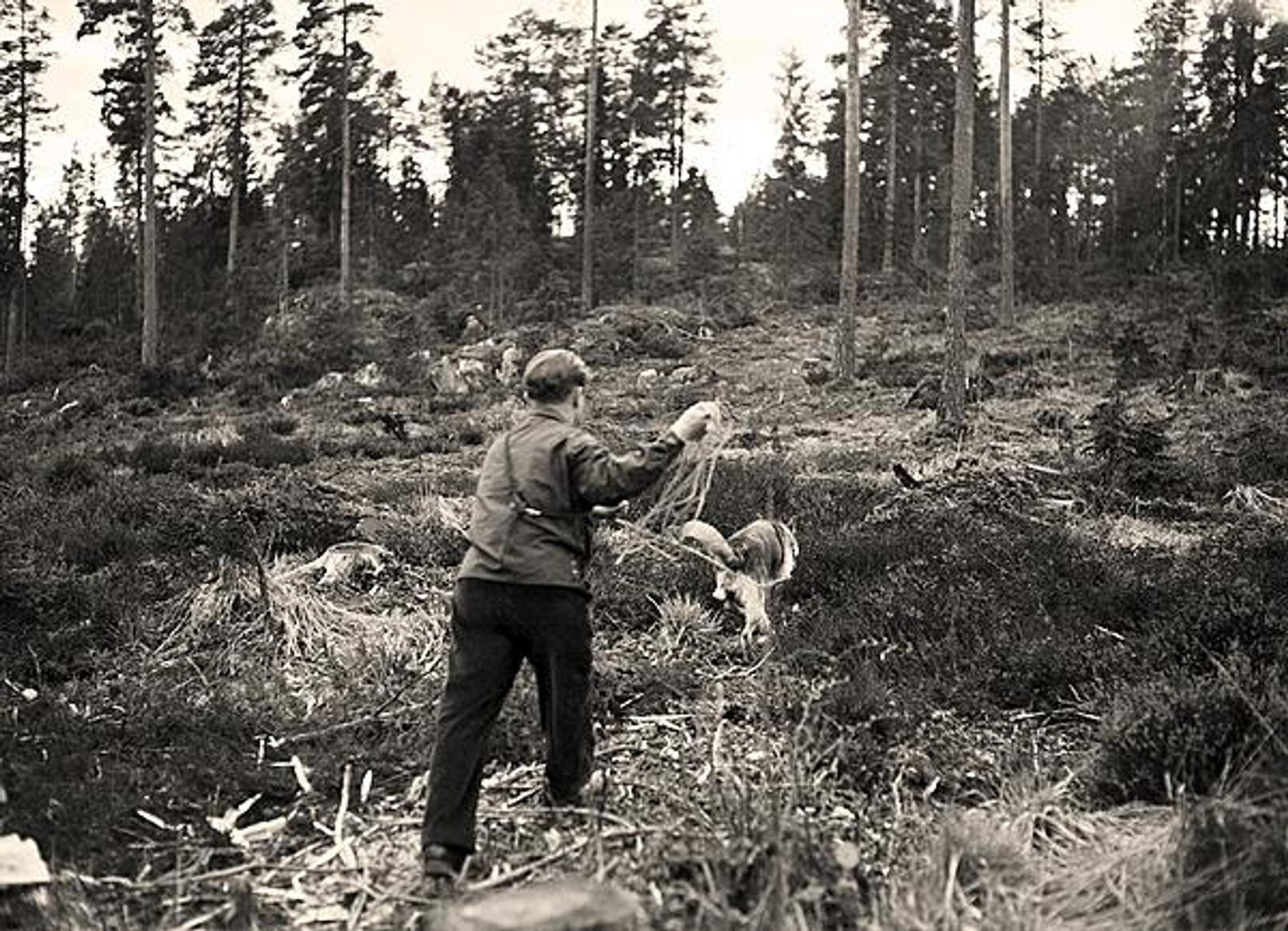 Kun toinen puolituntinen on vierähtänyt, kuulen koiran haukunnan aivan selvästi, ja se tulee oikealta suunnalta. Aina joidenkin väliaikojen jälkeen päästää koira muutaman terävän haukahduksen, ja sitten on taas hiljaista. Ilmeisesti se silloin löytää selvät ja hyvät jäljet.
