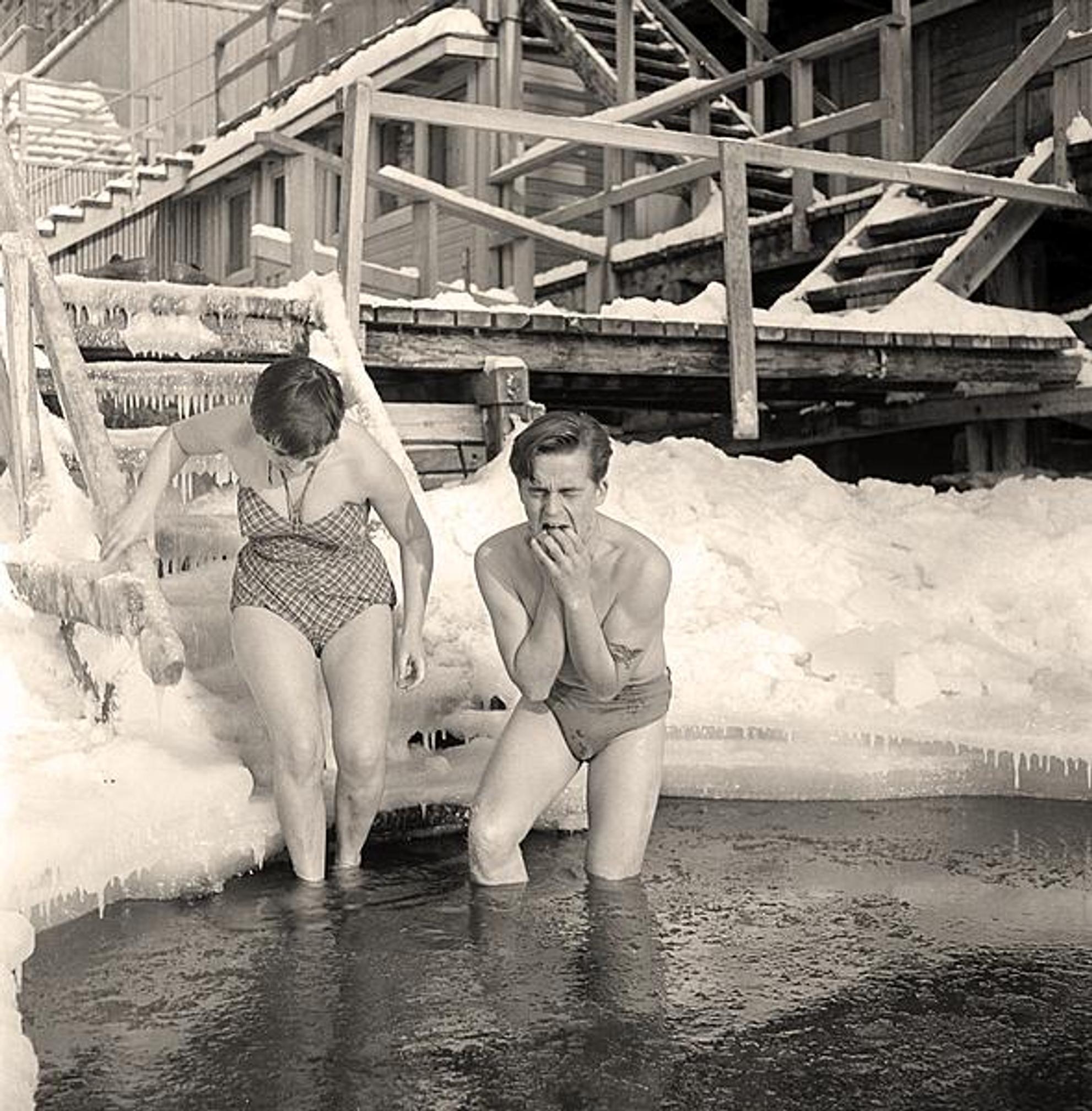 Harkitsen vielä vakavasti peräytymistä, mutta nähdessäni kilpailijani seisovan jo nilkkoja myöten avannossa, en voi tehdä muuta kuin seurata häntä. Jälleen askelma, olen nilkkoja myöten avannossa, seuraava porras, vielä yksi, seison polviani myöten kylmässä vedessä.