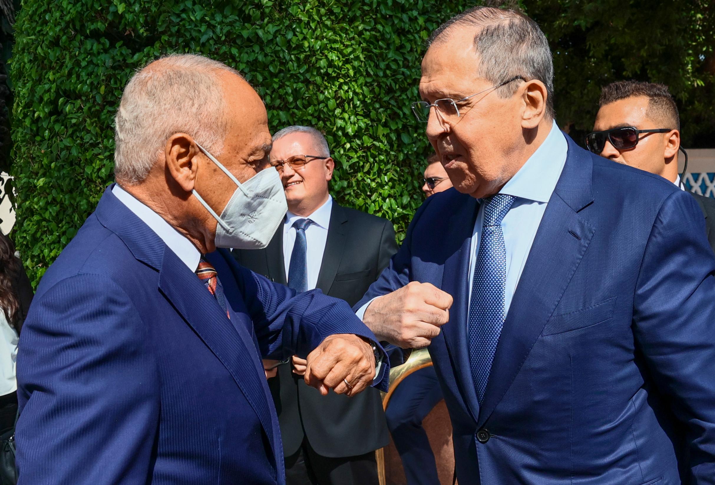Sergei Lavrov tervehtii Arabiliiton pääsihteeri Ahmed Aboul Gheitiä vierailullaan Egyptissä 24.7.2022.
