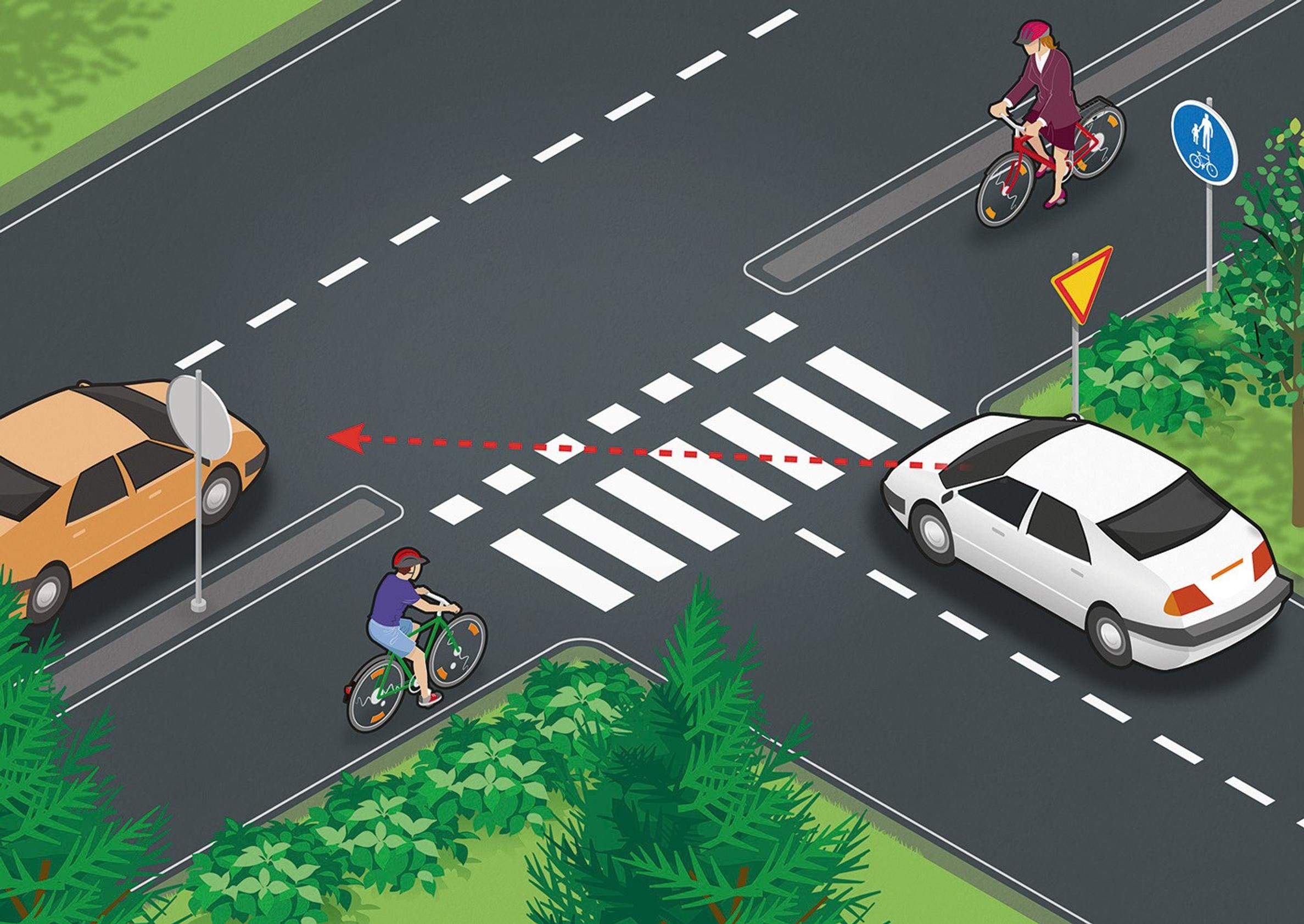 Kääntyessään ajoneuvon kuljettajan tulee väistää risteävää tietä ylittävää pyöräilijää. On huomattava, että tämä sääntö velvoittaa myös silloin, kun autoilija kääntyy vihreillä valoilla risteyksessä. Ainoastaan vihreä nuolivalo osoittaa, että risteävällä tiellä on jalankulkijoille ja pyöräilijöille punainen valo autoilijan kääntyessä.