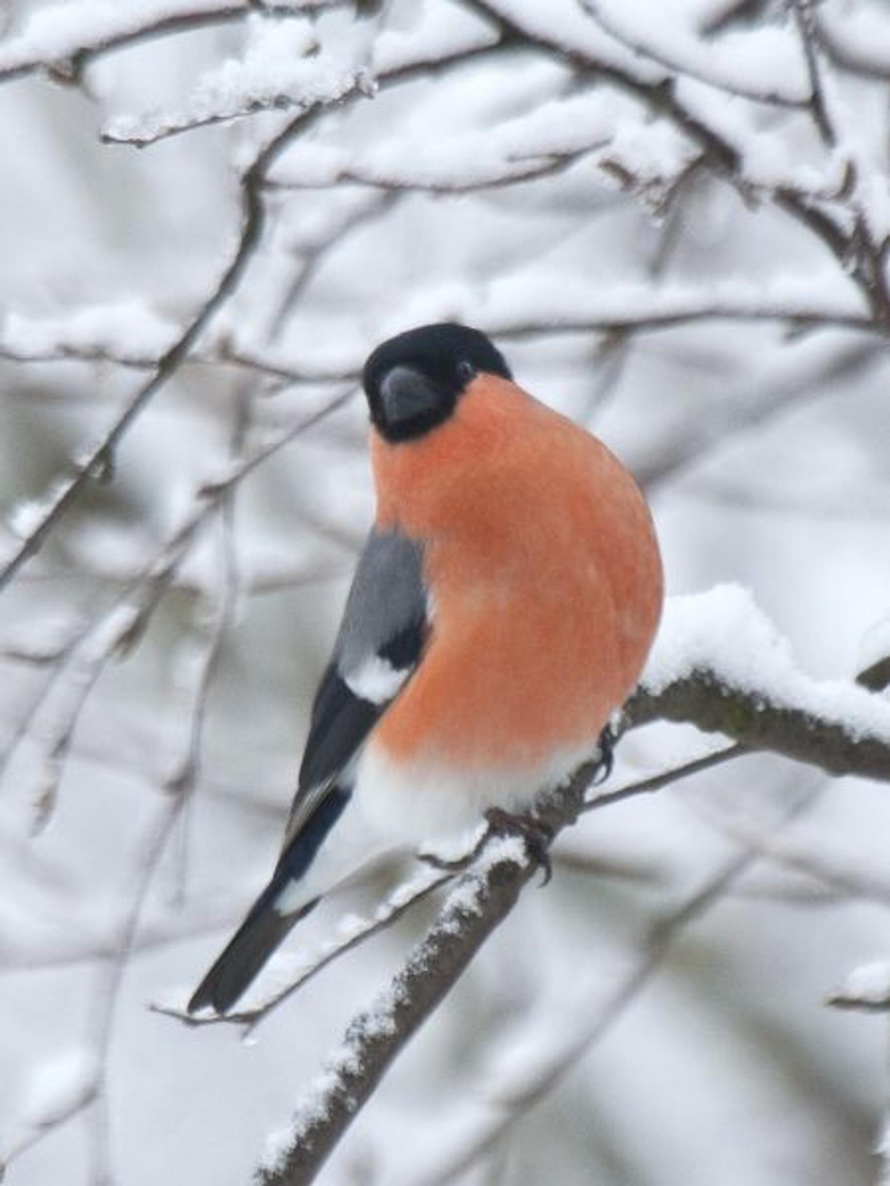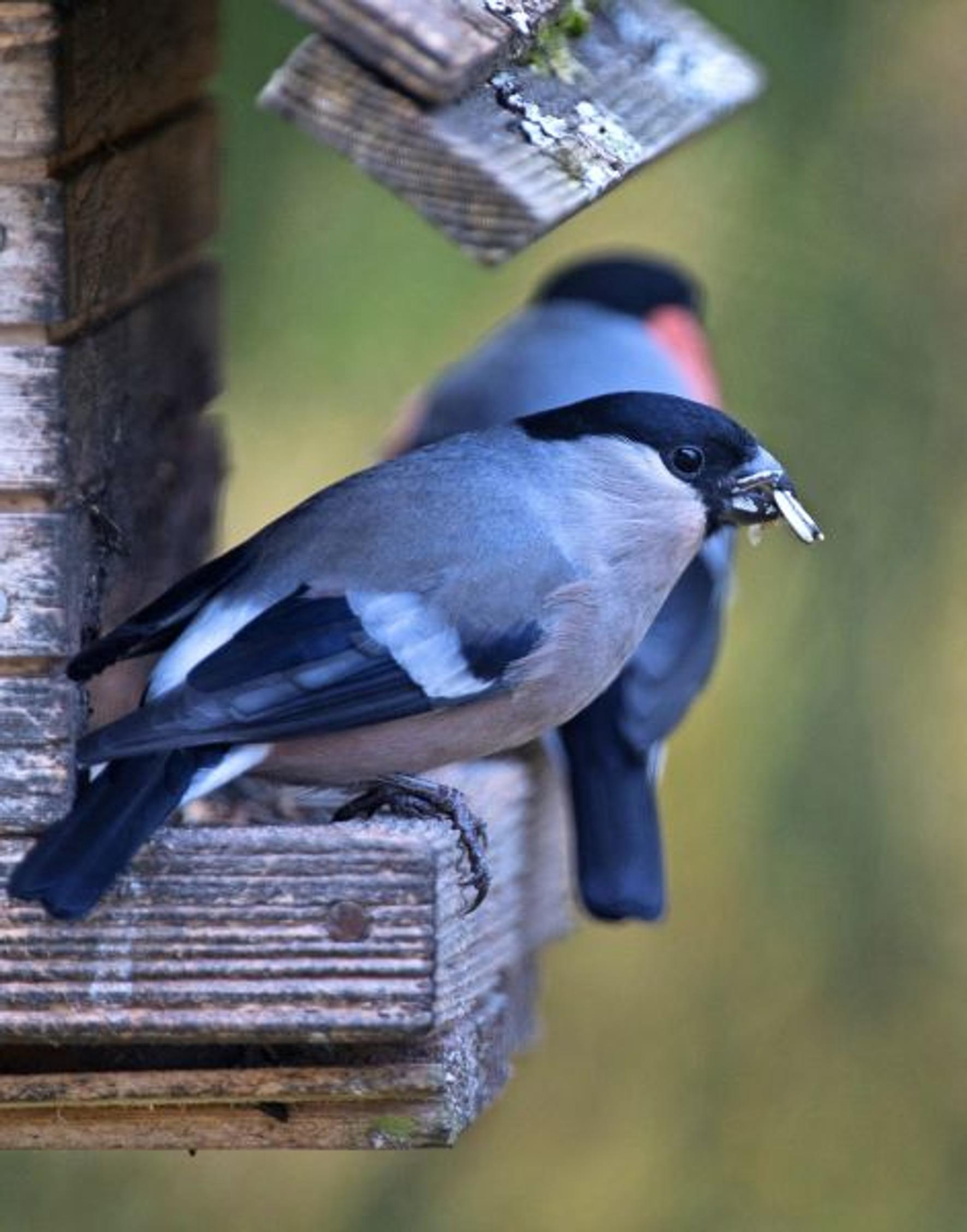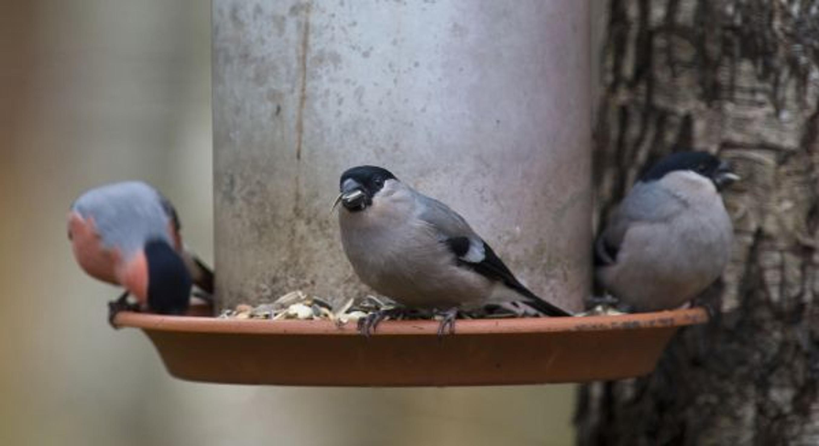 Auringonkukan siemenet ovat punatulkun herkkua talvella. Vahva musta nokka avaa tehokkaasti siementen kuoret ja puiden silmut.