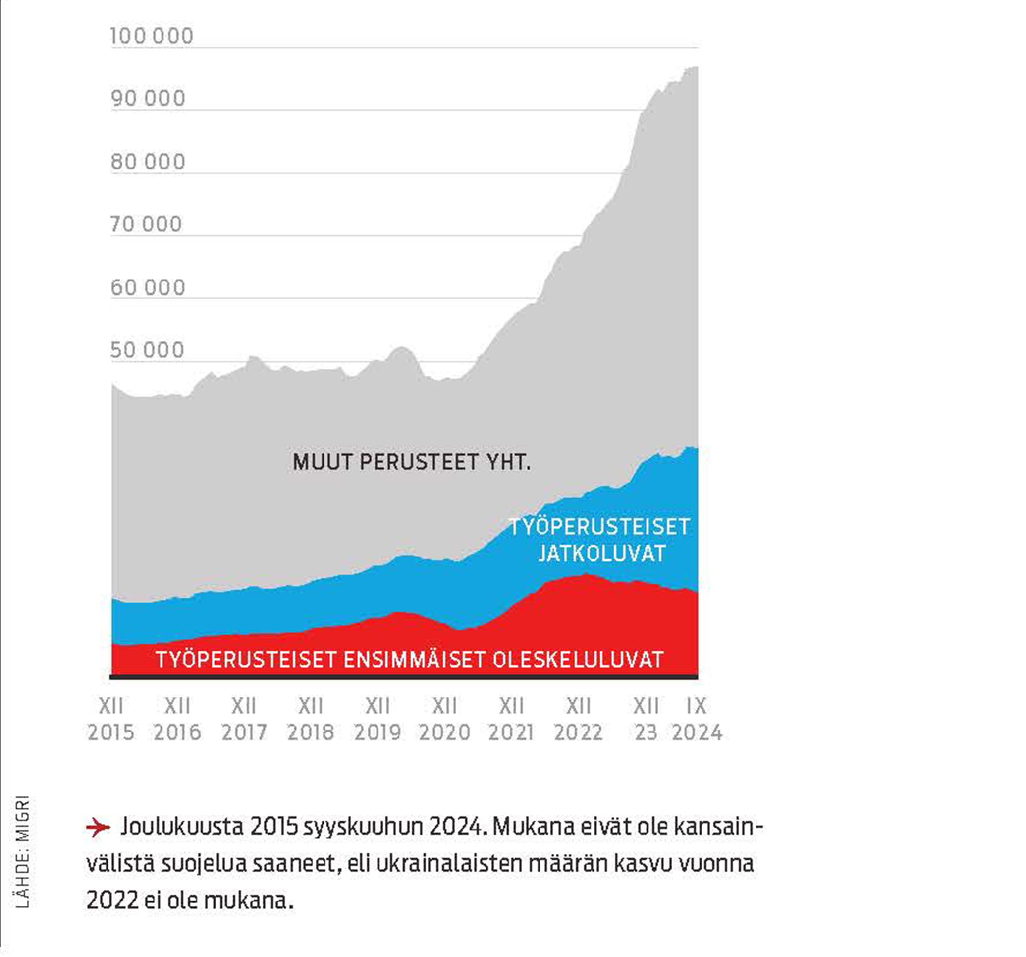 Nettomaahanmuutto eli maahanmuuton ja maastamuuton erotus on 2020-luvulla ollut kasvussa. Viimeksi se oli ennätyssuuri, lähes 58 000 ihmistä, mikä johtunee muun muassa ukrainalaisista. Viime aikojen kasvu on ilmiö, josta ei voi päätellä, mille tasolle maahanmuutto vakiintuu. Tulevaisuus on epävarma. Onko nousu poikkeus vai uusi normaali? Koska tulevaisuus on niin sumea, en laskisi julkisessa taloudessa liikaa työperäisen maahanmuuton varaan.