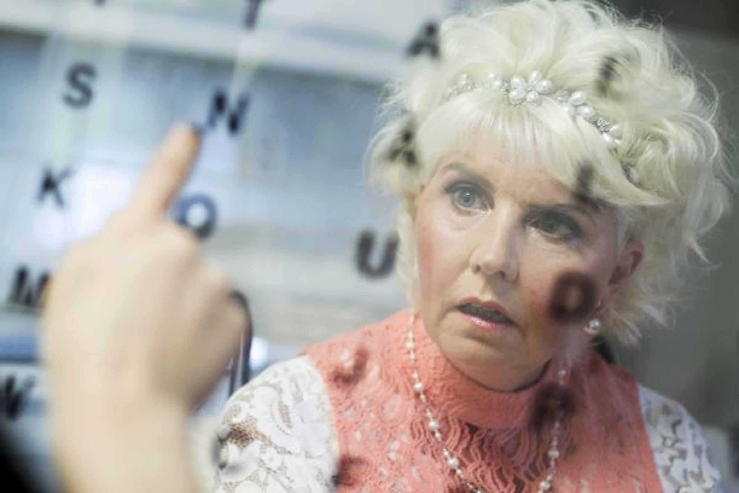 Korhonen katsoo kirjainta, avustaja näpäyttää sitä sormellaan, ja nainen hyväksyy sen räpäyttämällä pitkiä silmäripsiään.