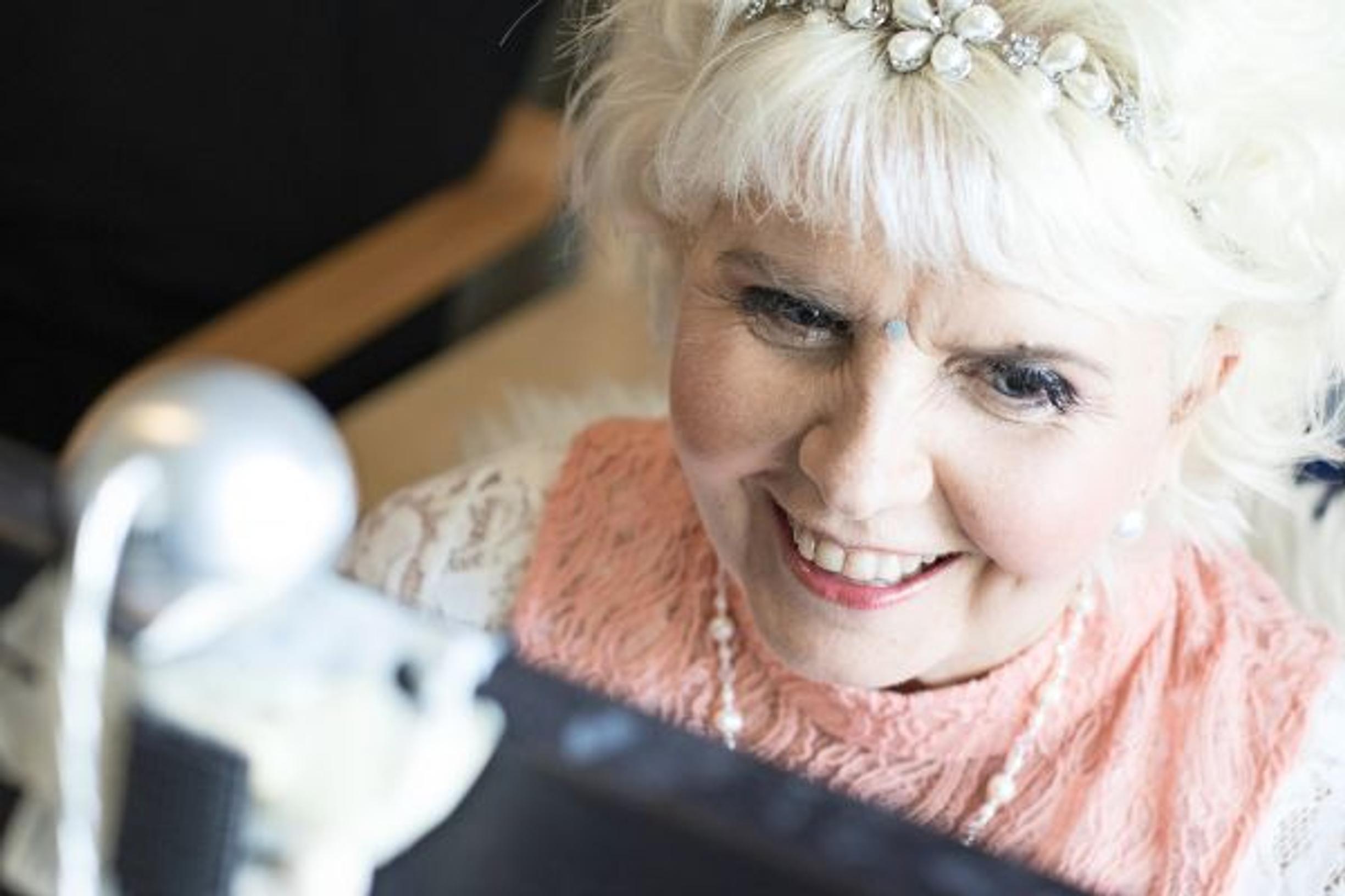 Marja kirjoittaa otsaan kiinnitettävän hopeisen sensorin avulla, joka on yhteydessä tietokoneeseen. Kursori liikkuu tietokoneen näytöllä pään asennon mukaan.