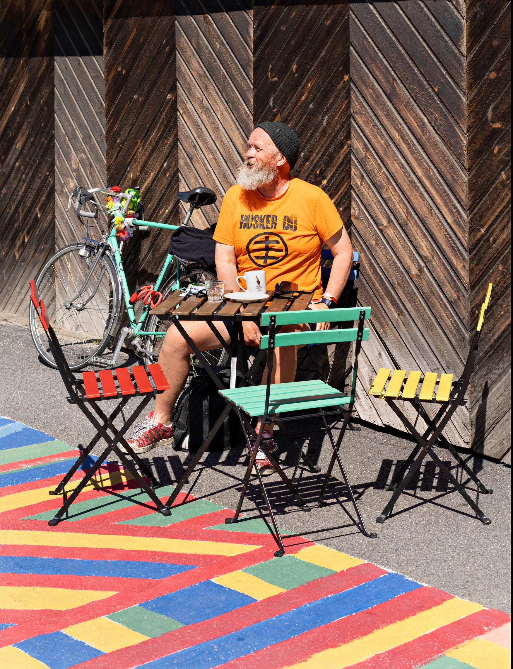 Oranssiin Hüsker Dü -yhtyeen paitaan pukeutunut mies siemailee kahvia katuterassilla, jonka tuolit ja pöydät ovat eri värisiä. Jalkakäytävään on maalattu värikästä mattoa muistuttava koristelu. Tämähän on kuin Kainuun Berliini! Vain rakennuksen kylkeen maalattu teksti ”Leipurin riihikahvila” palauttaa ajatukset takaisin Kajaanin keskustaan.