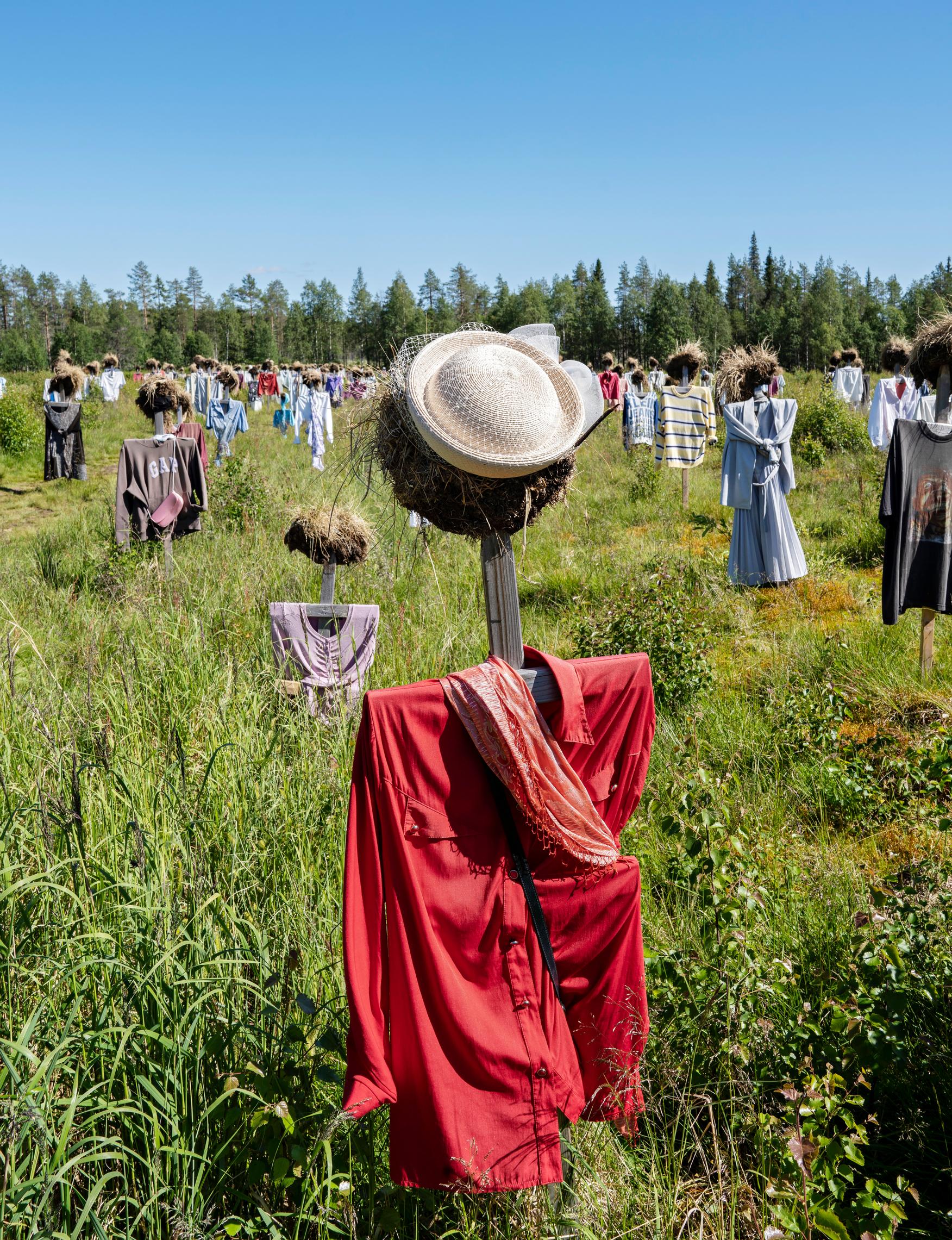 Suomussalmelaiselta pellolta löytyy yksi Suomen tunnetuimmista ympäristötaideteoksista. Valtatie 5:n laidalla seisoo tuhatkunta variksenpelättimen kaltaista hahmoa, joilla on turvepäät. Kaksi kertaa vuodessa ne saavat uudet vaatteet, ja ensisilmäyksellä näyttääkin siltä, kuin pellolle olisi levitetty jonkin kirpputorin koko valikoima.