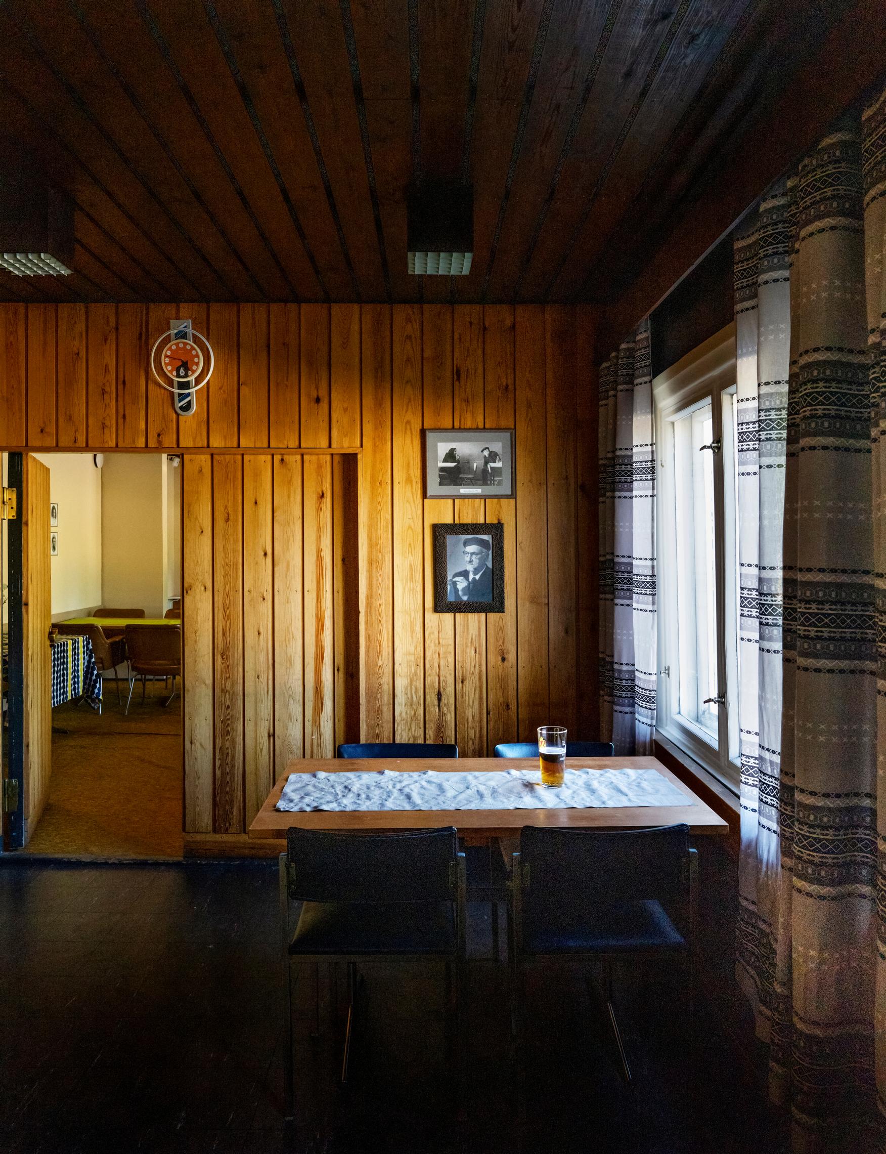 Tuolit ovat alkuperäiset ja pöytälevyjen mustat täplät siltä ajalta, kun sisällä sai vielä tupakoida. Juntunenkaan ei aio sisustukseen koskea, vaikka tuolit on hitsattu kasaan ”sen seitsemän kertaa”.
