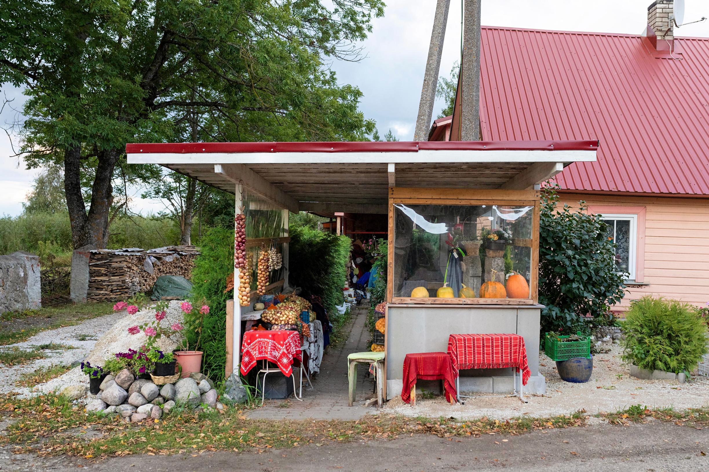 Autotien varressa on pressuteltta ja sen edessä myyntipöytä, jossa on kaupan muun muassa omenoita, porkkanoita ja valkosipulia. Olemme Kolkjan kylässä, Peipsijärven sipulitiellä.