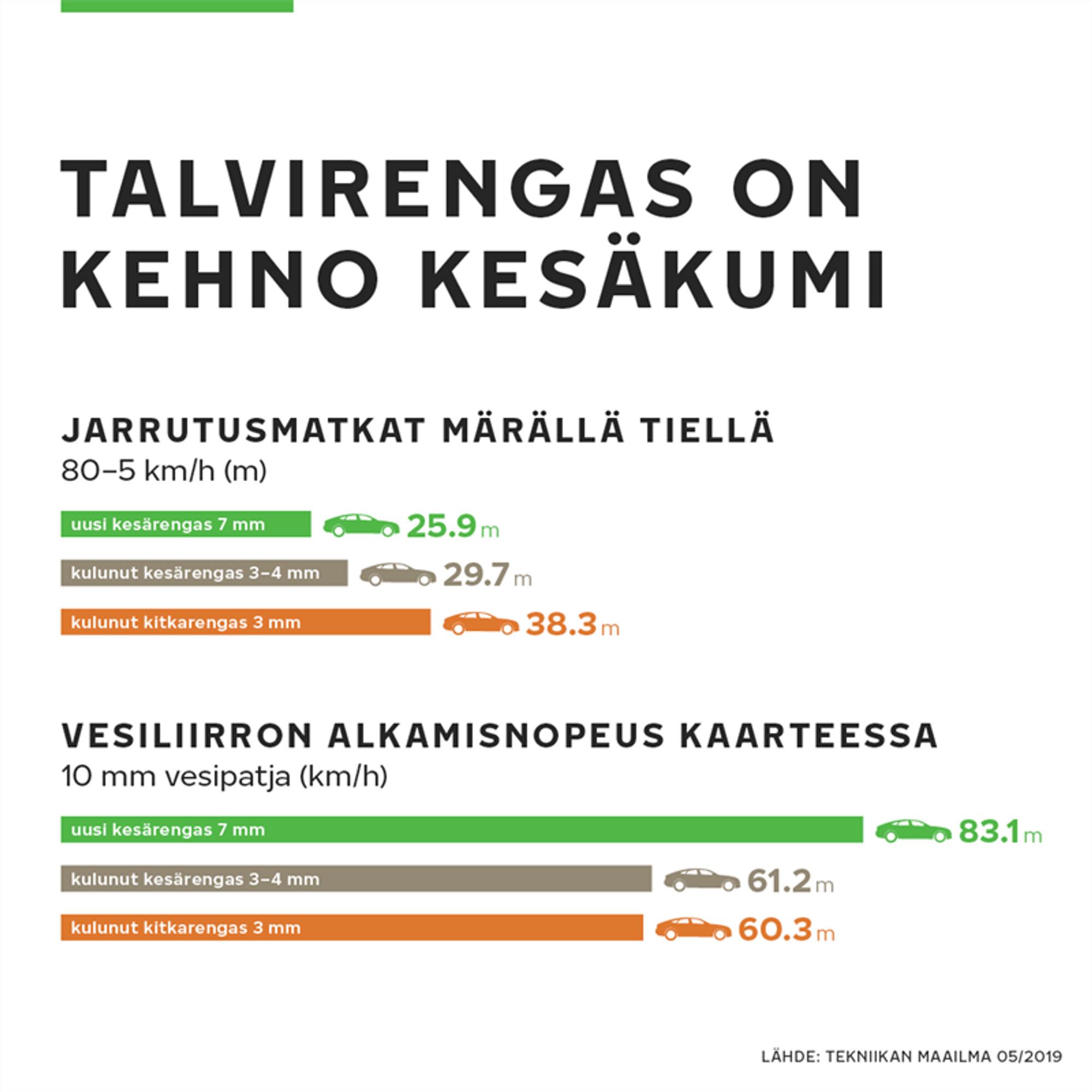 Tekniikan maailman (6.3.2019) tuore kesärengastesti osoittaa, että kun kuluneella kitkarenkaalla jarruttaa 80 kilometritunnin nopeudesta märällä asfaltilla, vauhtia on vielä yli 40 km/h kohdassa, johon uusi kesärengas pysähtyy. Myös kuivalla asfaltilla jarrutuspito on selkeästi kesärenkaita heikompi.