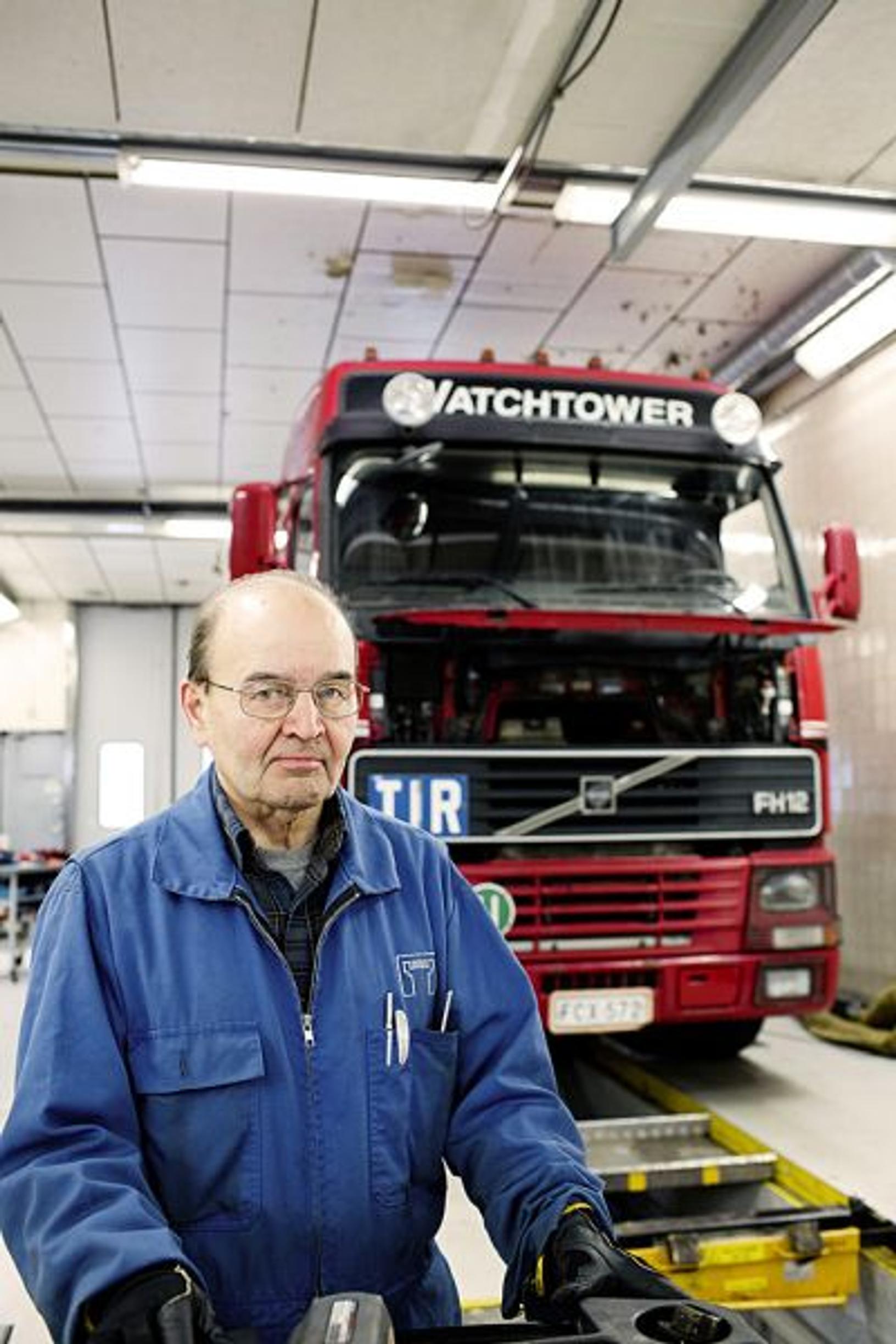 Laskeudumme portaat alakerroksen autokorjaamoon, jossa seisoo näyttävällä Watchtower-tarralla koristettu tummanpunainen rekka. Sinisiin haalareihin ja lippalakkiin sonnustautunut Keijo Kiiski häärää rekan vierellä vuotavien jarrusylintereiden kimpussa. 40 vuotta kommuunissa asuneella Kiiskellä on hurahtanut 20 viime vuotta korjaamolla. Sitä ennen hän työskenteli yhteisössä muun muassa kirjapainossa ja sitomossa.