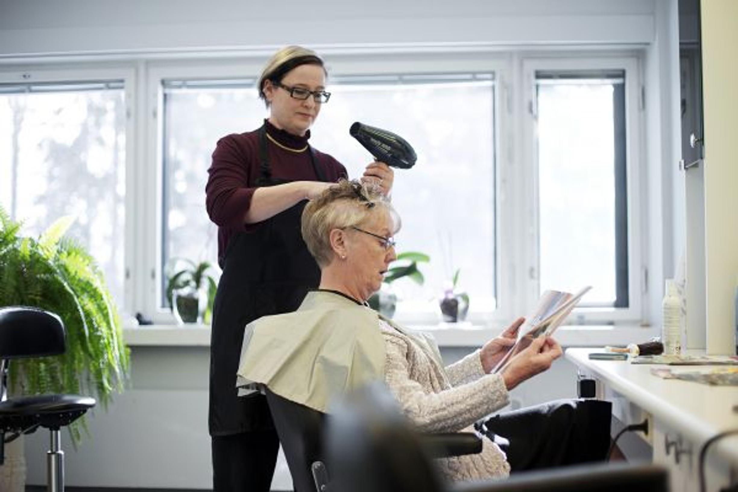 Jatkamme kierrosta ja kuljemme ohi kampaamon, jossa Taina Lindroos vääntää Ulla Strömforsin hiuksia kiharoille. Lindroos on asunut ja työskennellyt Betelissä 29 vuotta ja Strömfors yli 36 vuotta.