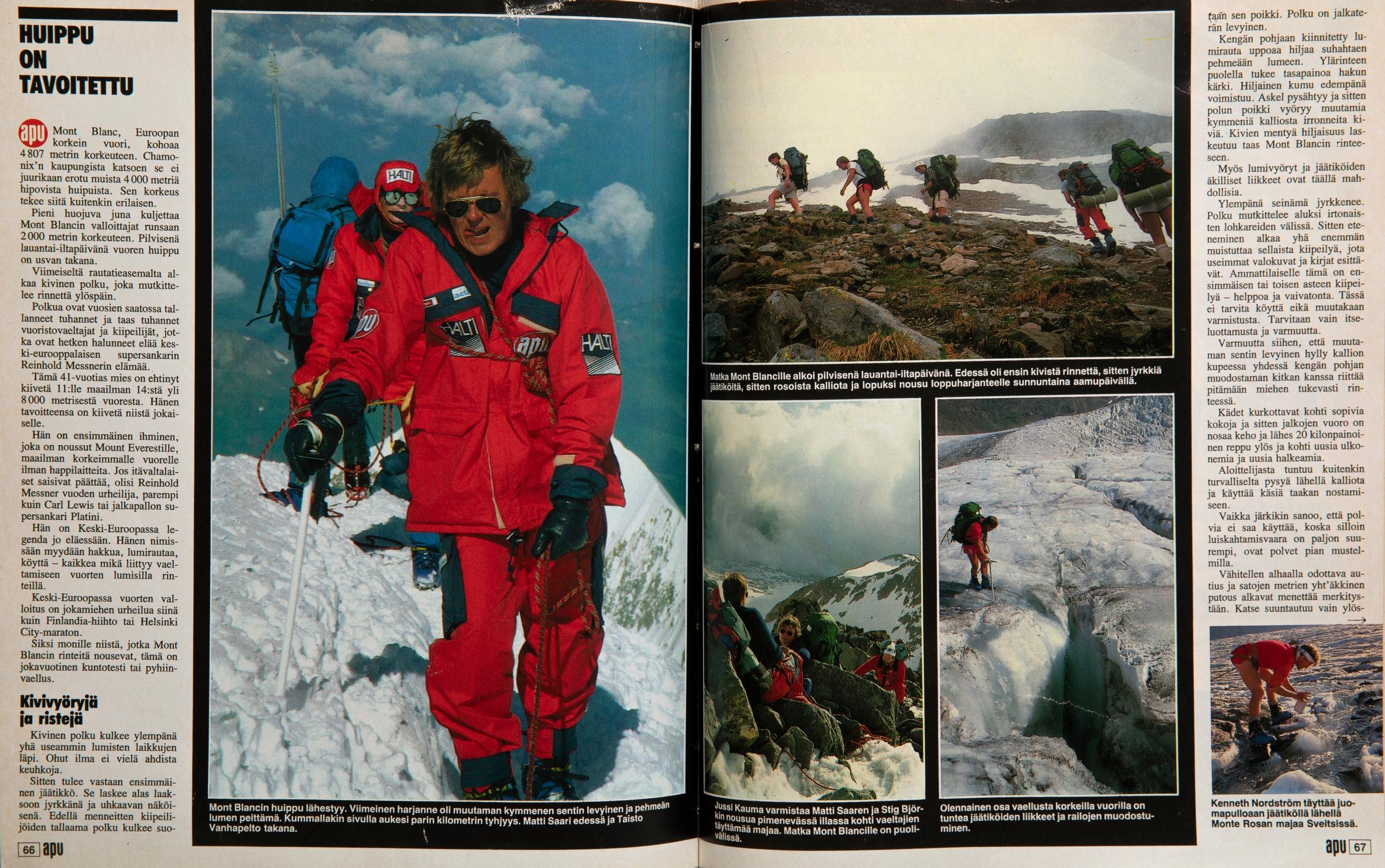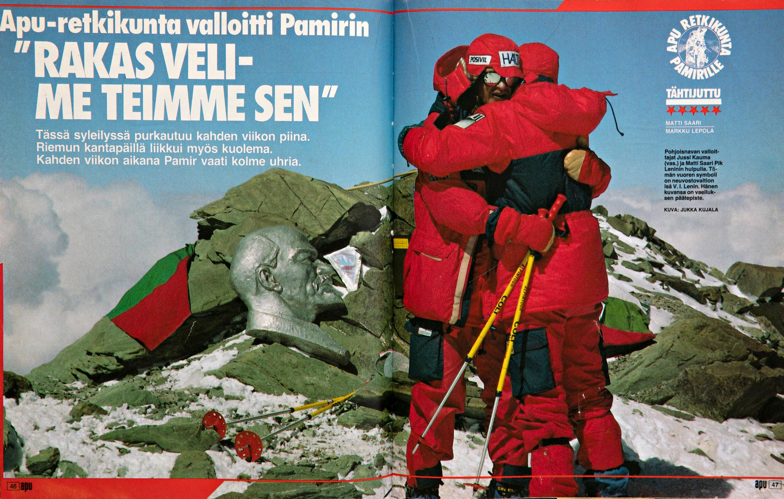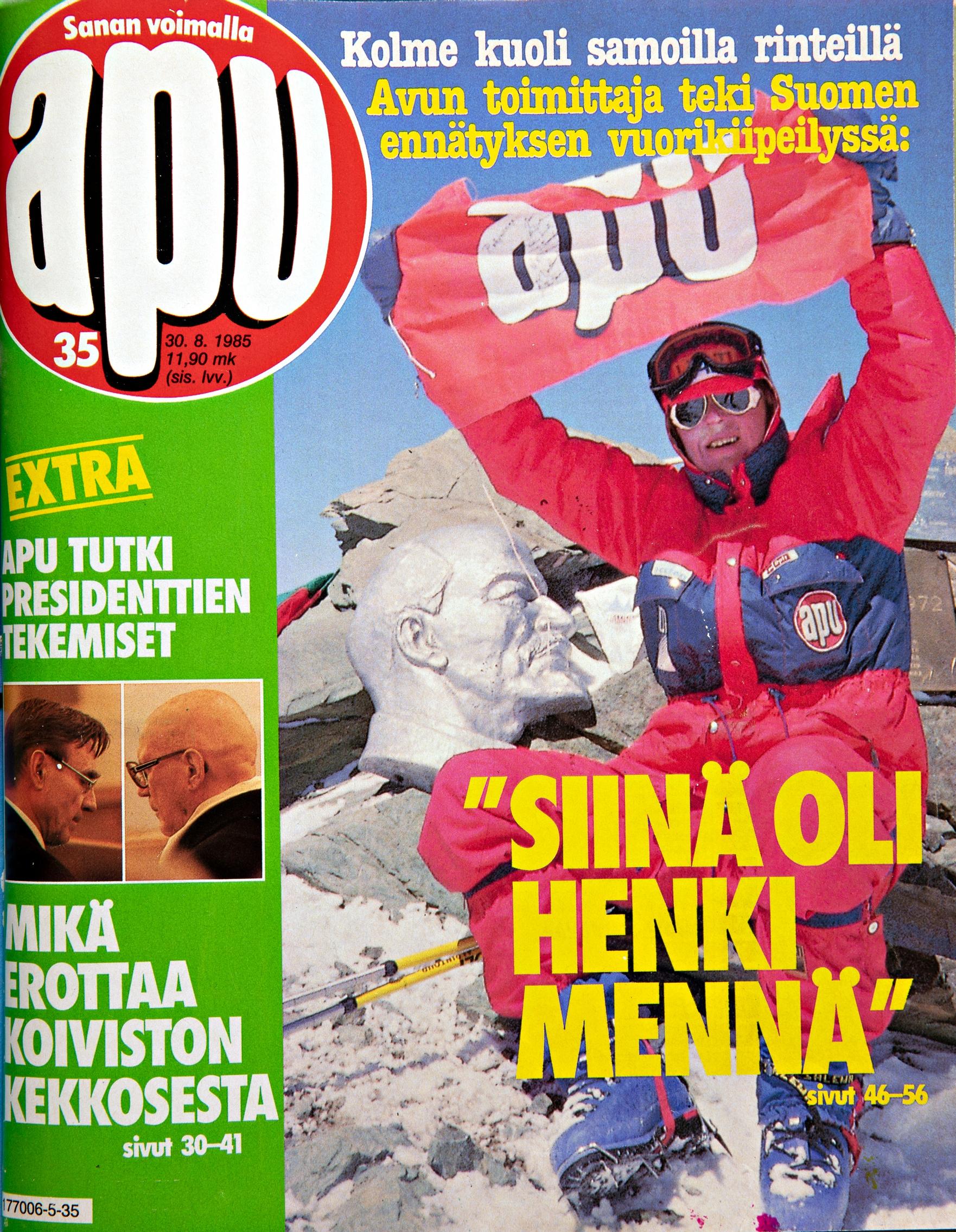 Ensimmäisenä suomalaisryhmästä huipulle astunut Apu-lehden silloinen toimituspäällikkö Matti Saari pitelee kansikuvassa Apu-lippua. Otsikossa lukee ”Siinä oli henki mennä”. Se ei ollut liioittelua.