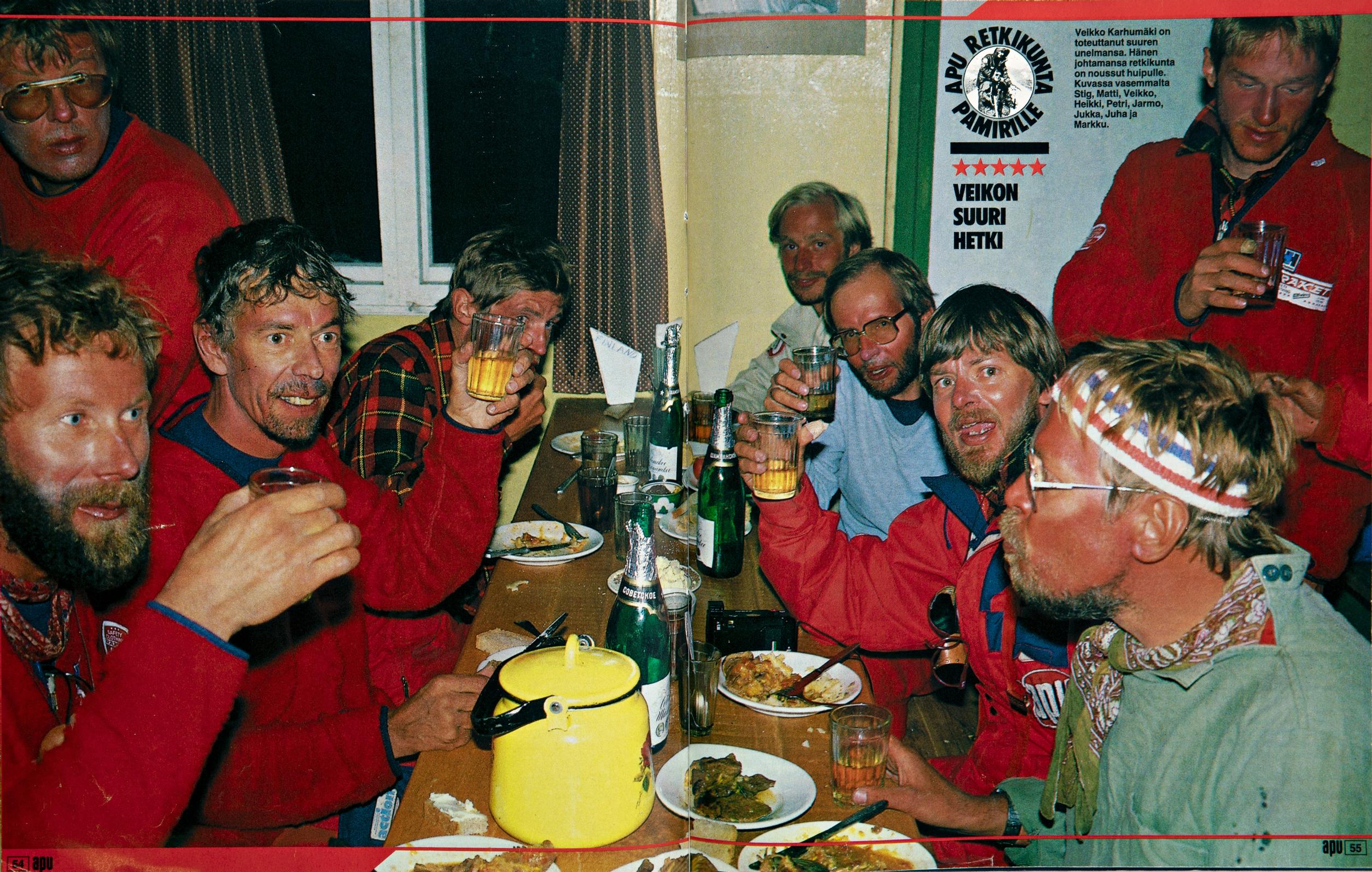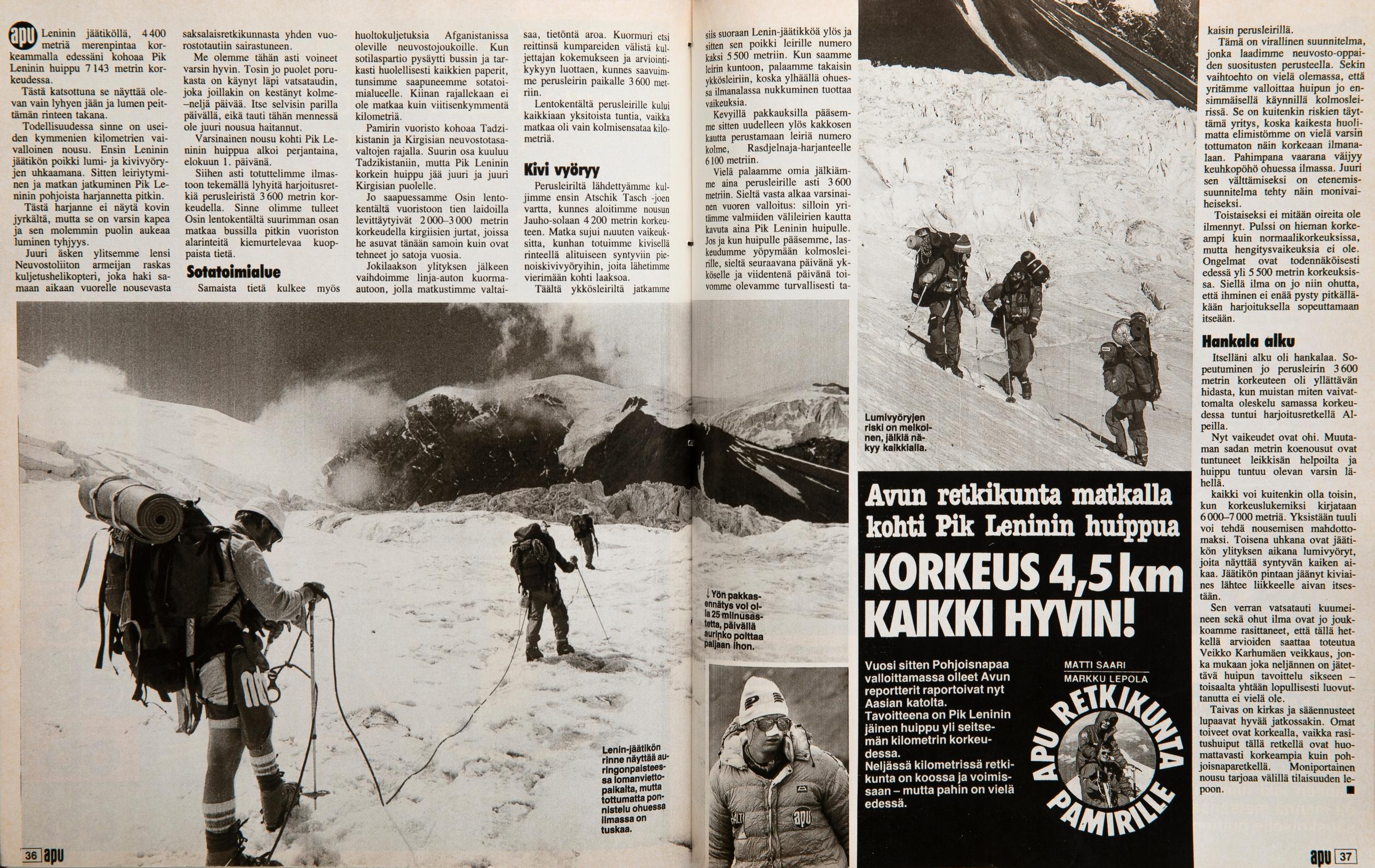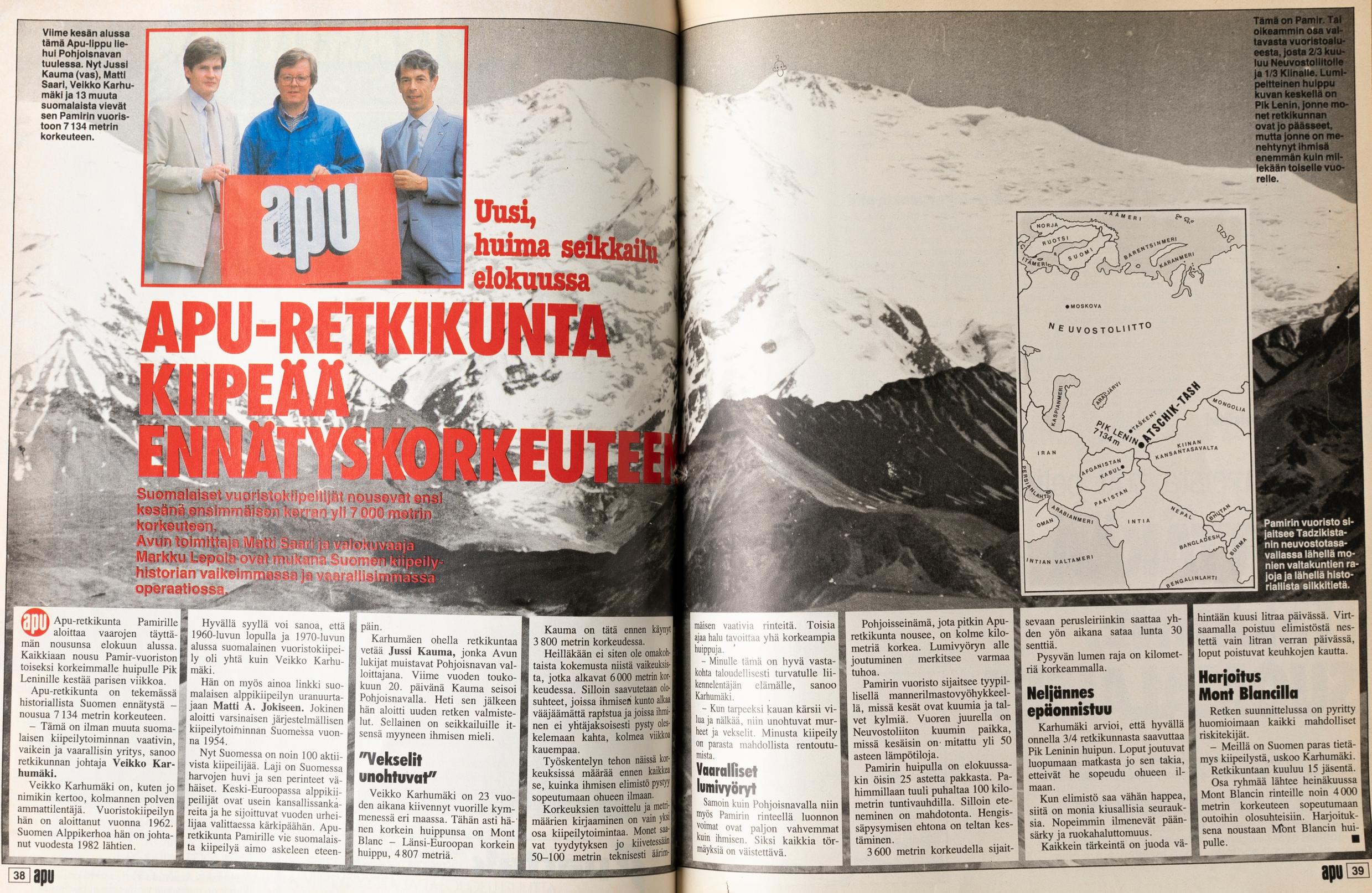 Ensimmäisenä suomalaisryhmästä huipulle astunut Apu-lehden silloinen toimituspäällikkö Matti Saari pitelee kansikuvassa Apu-lippua. Otsikossa lukee ”Siinä oli henki mennä”. Se ei ollut liioittelua.