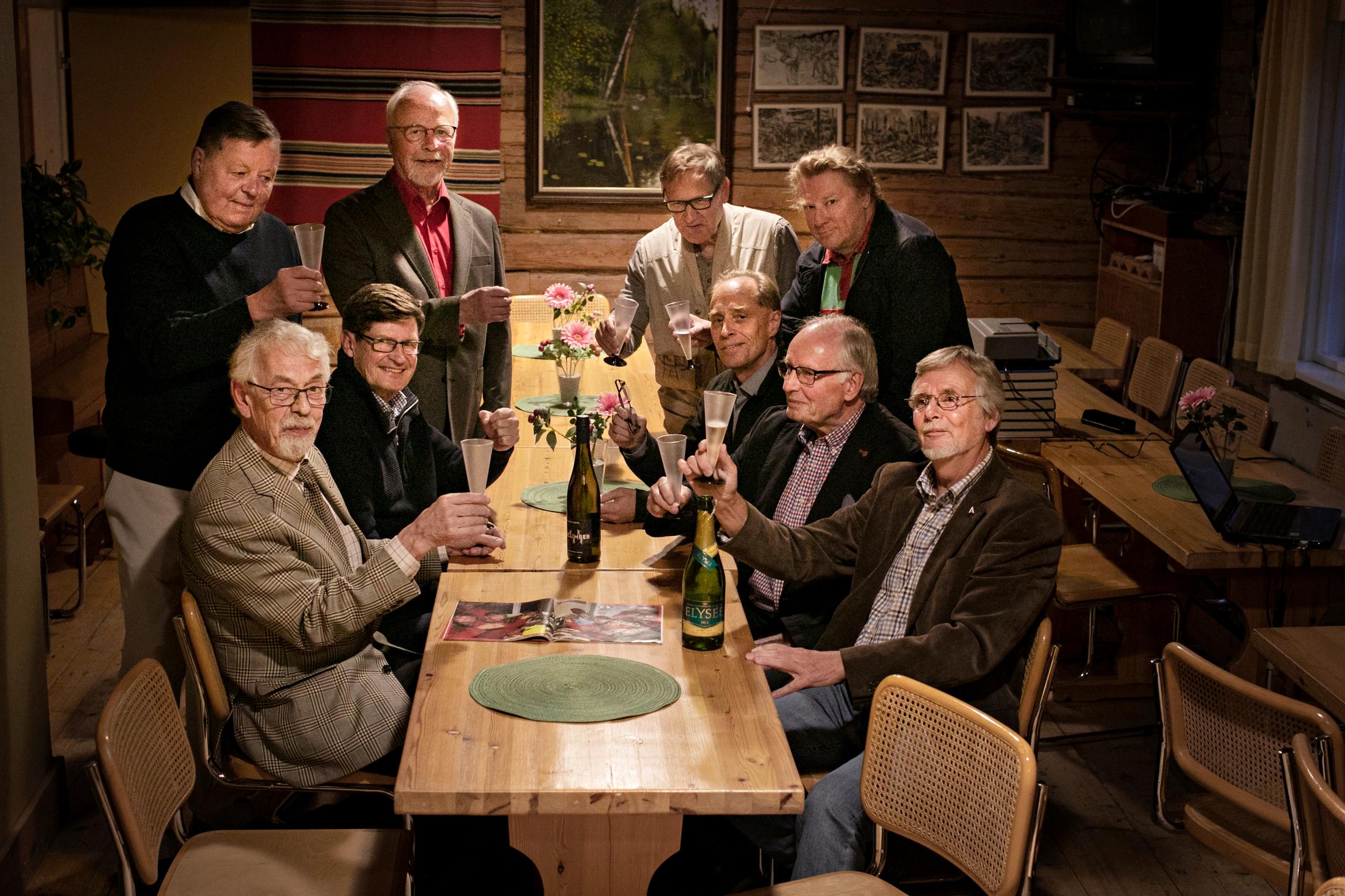 Leveitä hymyjä, koronatervehdyksiä (kyynärpäillä kolauttelua kättelyn sijaan), kuulumisten vaihtoa. Kun hälinä loppuu, Apu-retkikunnan johtaja Veikko Karhumäki johtaa miesjoukon hiljaiseen hetkeen, joka pidetään kolmen poisnukkuneen muistoksi.