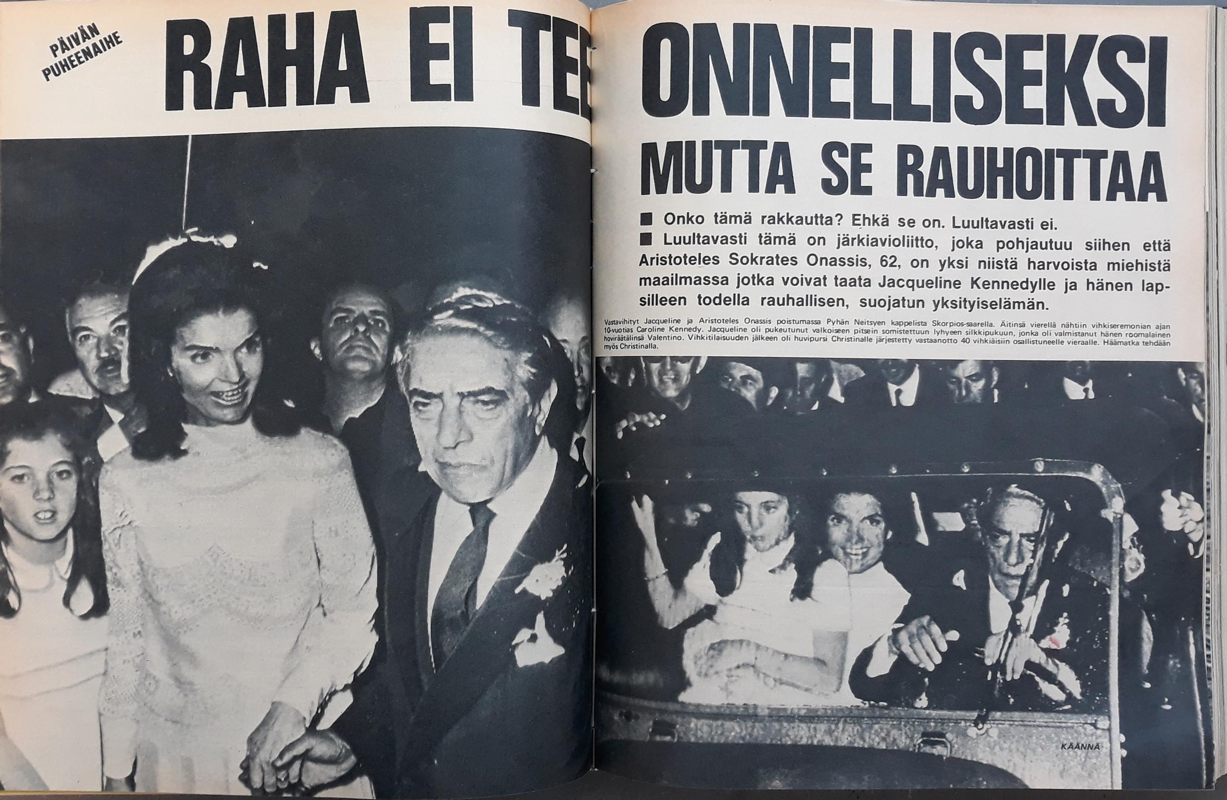 Vaan toisin kävi. Vain kolme päivää ehti kulua, kun Yhdysvaltain edesmenneen presidentti John F. Kennedyn 39-vuotias leski vihittiin ortodoksisin menoin 62-vuotiaan laivanvarustaja-multimiljonääri Aristoteles Onassiksen puolisoksi Pyhän Neitsyen kirkossa Skorpios-saarella Kreikan länsirannikolla.
