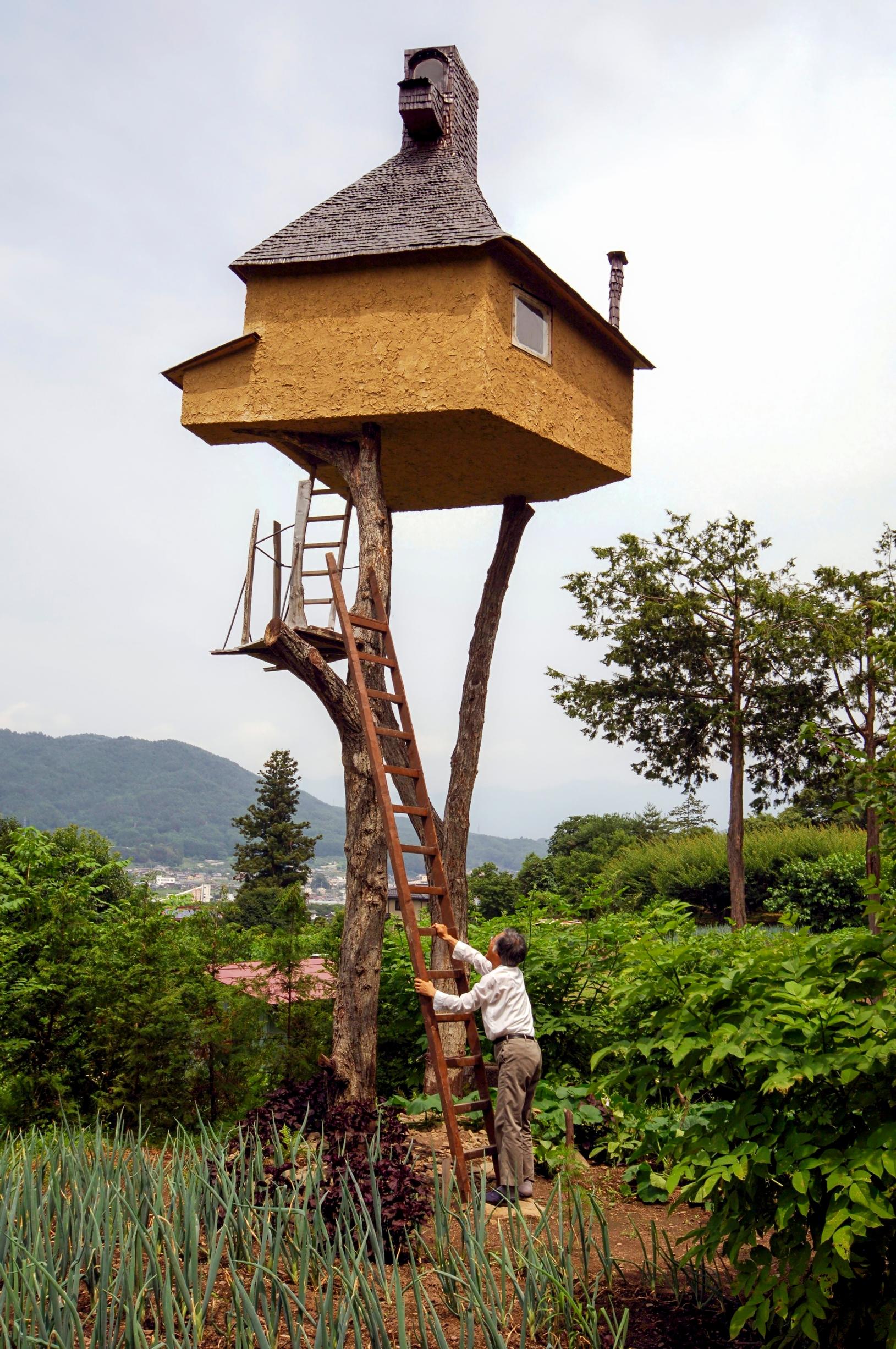 Näky on kuin Hayao Miyazakin anime-elokuvasta. Japanilaisen arkkitehdin Terunobu Fujimorin suunnittelema teehuone seisoo kahden puun latvassa, ja sinne täytyy kiivetä tikapuita pitkin.