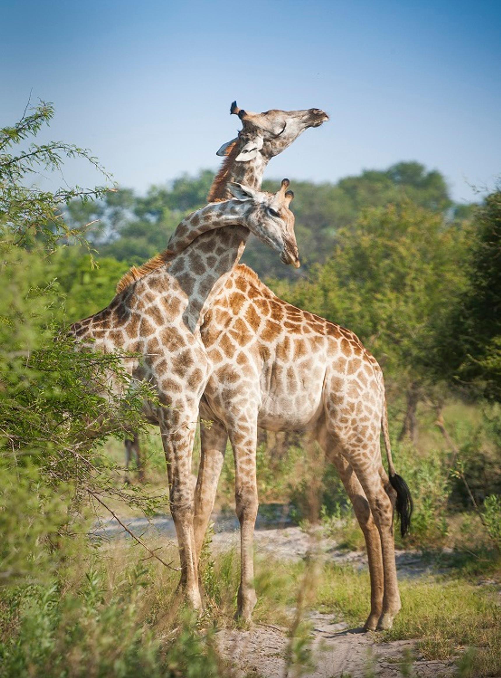 Kapinga sammuttaa moottorin, ja ihailemme kirahvien äänetöntä kauneutta. Välillä pari niistä nujakoi keskenään läiskimällä pitkiä, vahvoja kaulojaan vastakkain. Rauhallista kaveripainia nelimetristen, yhtä aikaa sirojen ja kömpelöiden eläinten kesken.