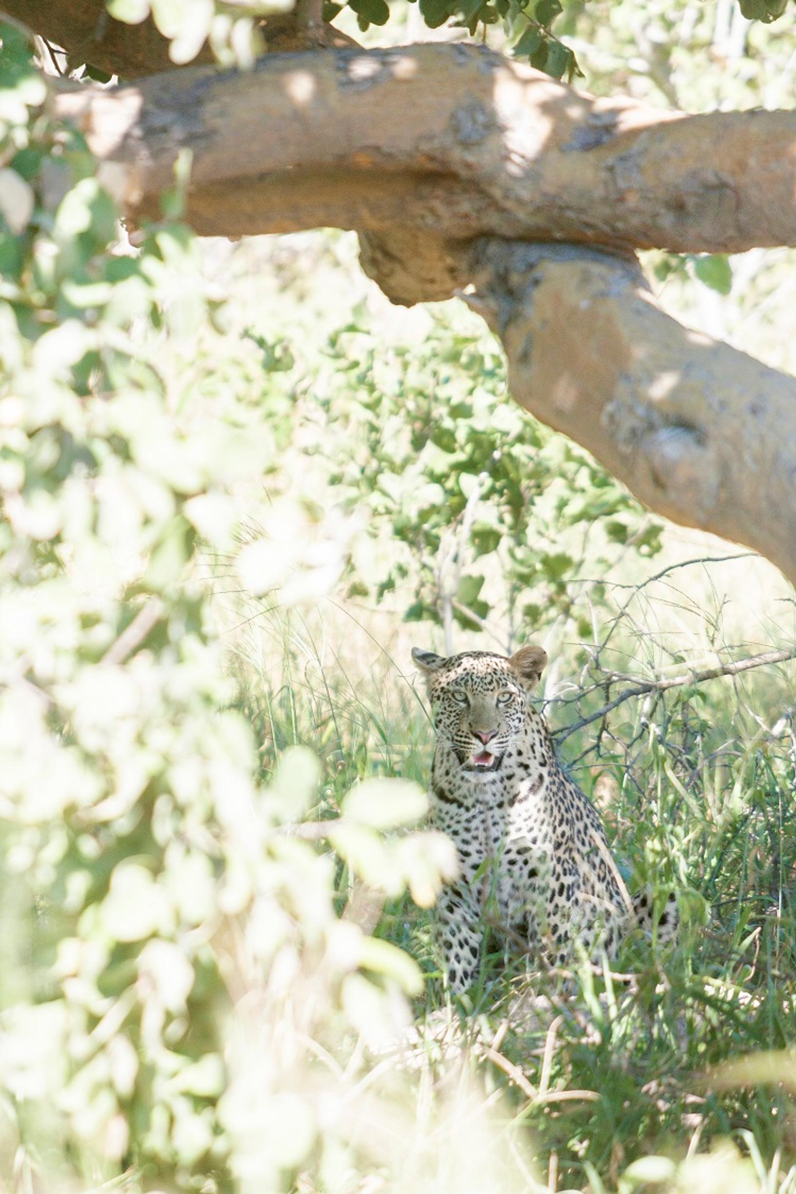 Löydämme nuoren naarasleopardin parinkymmenen metrin päästä, lepäämästä puun alla. Se vain vilkaisee autoamme – enemmän sitä kiinnostavat alueella vilistävät pikkujyrsijät, joista se toivoo ateriaa. Pian leopardineito lähtee taas liikkeelle. Me seuraamme. Jeeppi tempoilee puiden ja pensaikkojen keskellä niin, että on pideltävä kiinni.