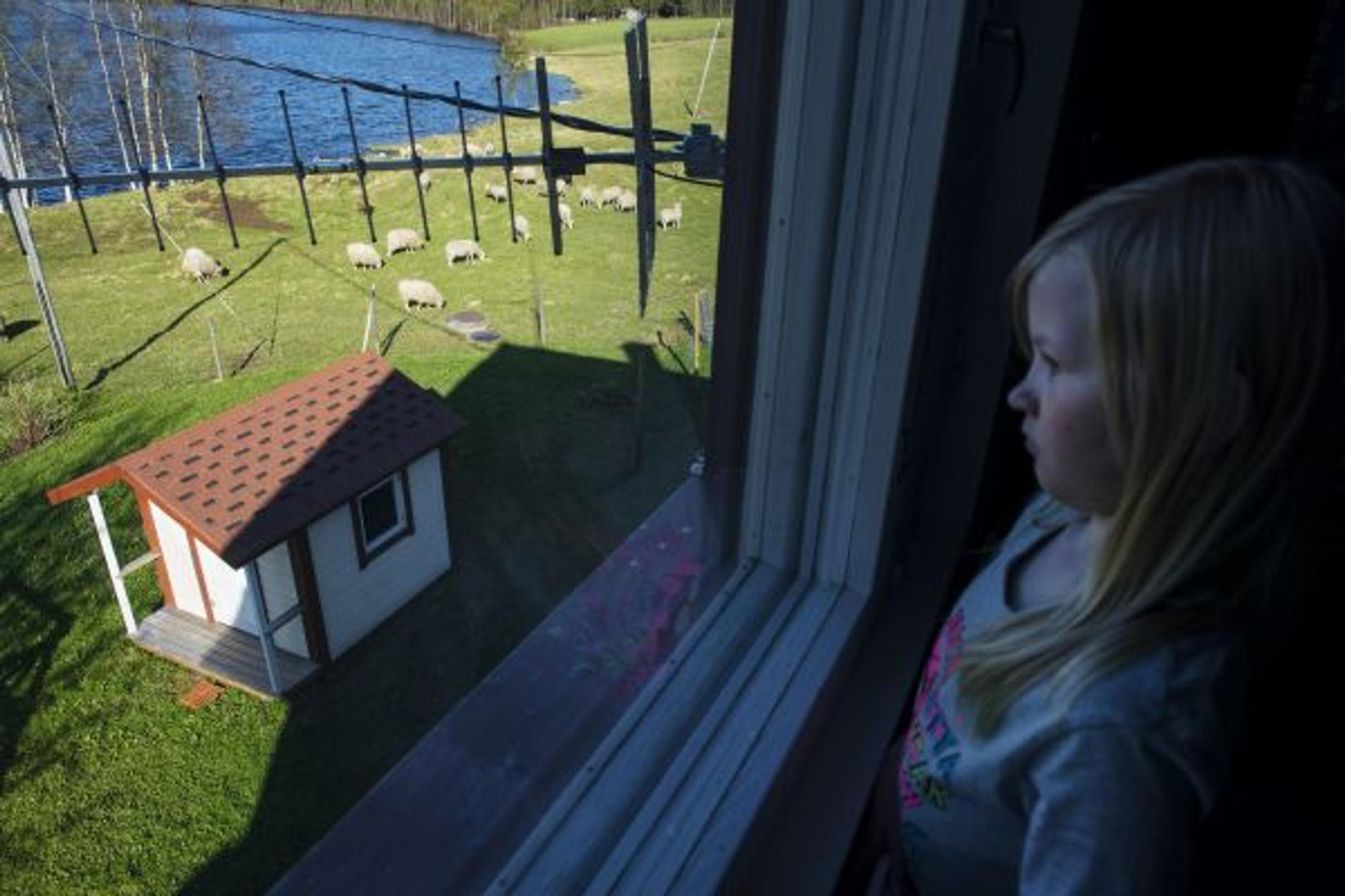 Aino katsoo välitunnilla kodin yläkerran luokan ikkunasta lampaita.