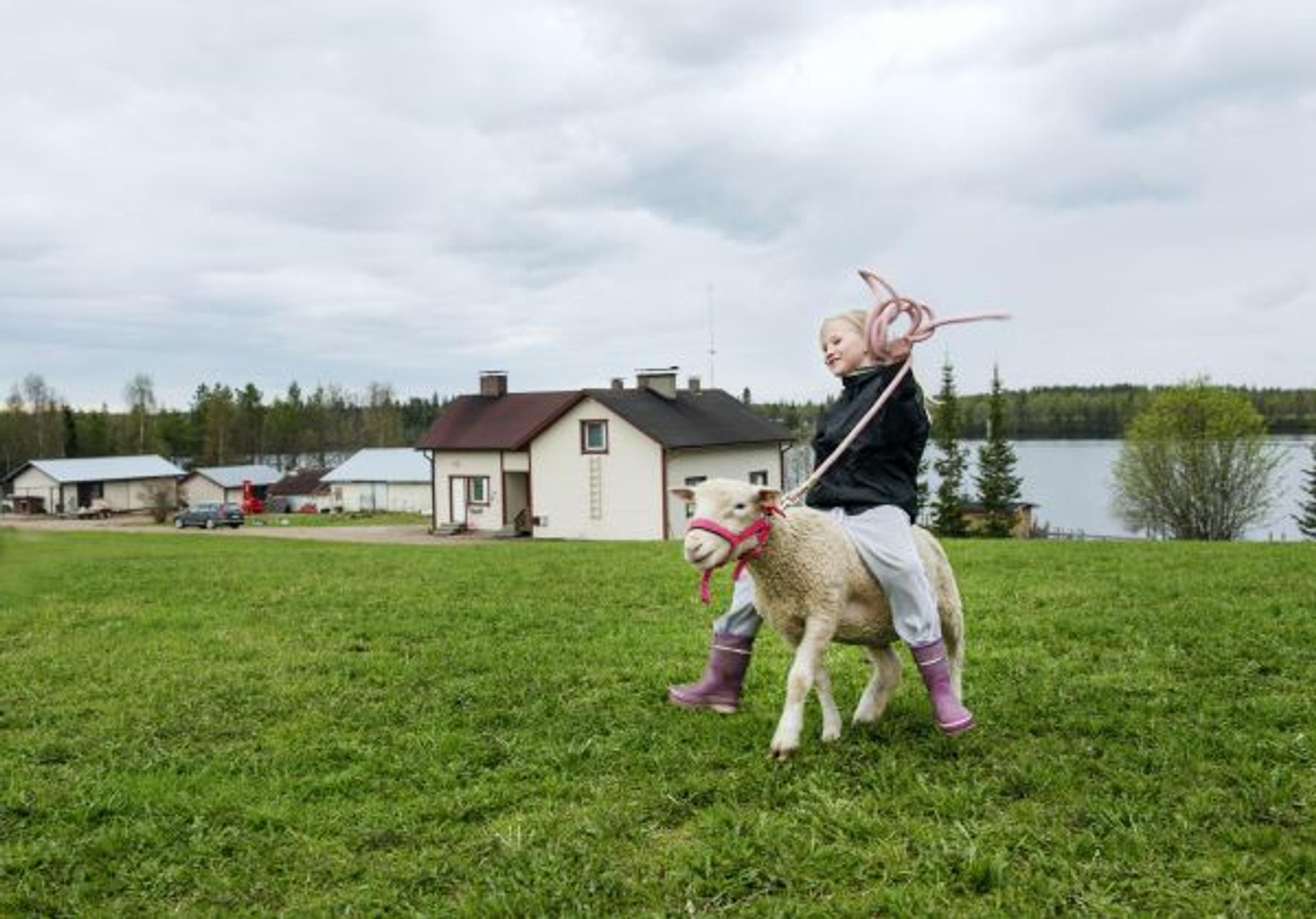 Sallan Kirkonkylän koulun toisen luokan oppilas Aino Kantola, 9, ratsastaa Lumikki-nimisellä lampaalla Sallan Paloperän kylällä. Ollaan kaukana kaikesta.