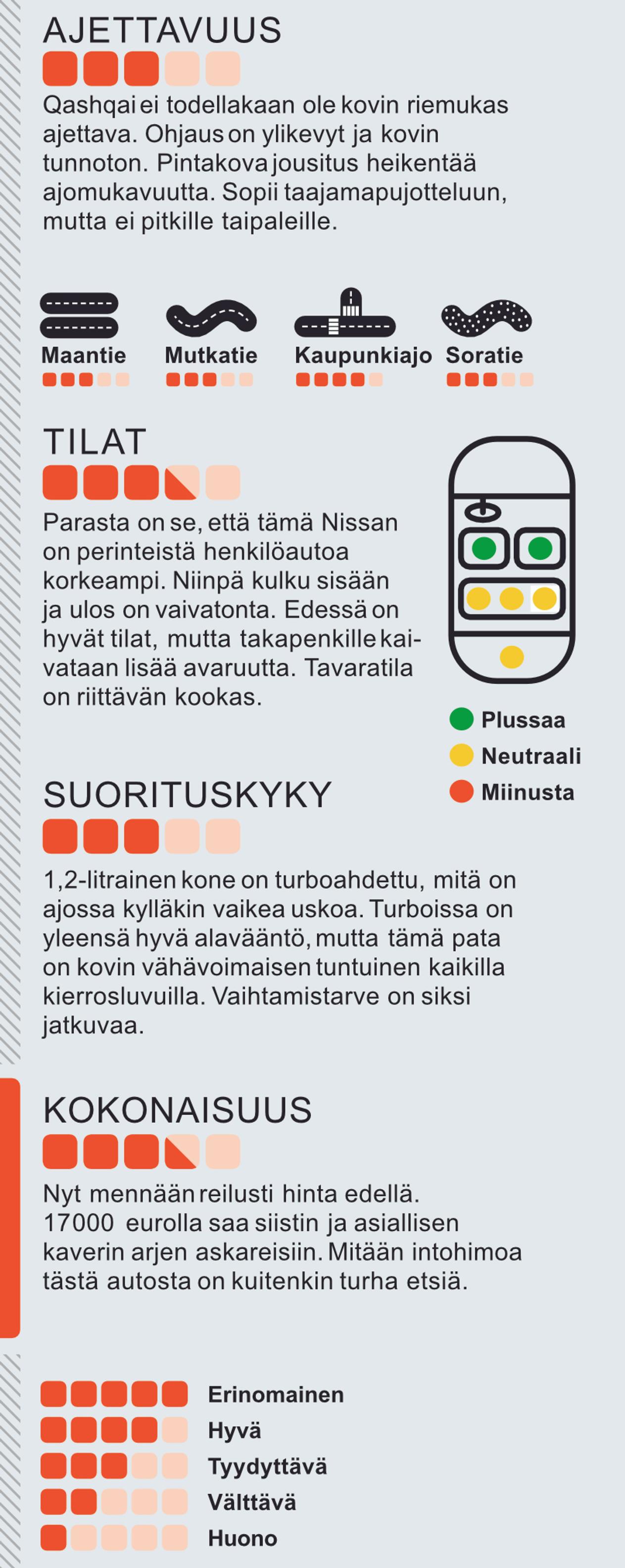 Näin jälkikäteen voi sanoa, että olimme Qashqain suhteen täysin väärässä. Selvistä puutteistaan huolimatta tästä uutuusmallista tuli hittituote kaikkialla Euroopassa. Suomessa Qashqai on keikkunut myydyimpien automallien joukossa jo yli kymmenen vuotta.