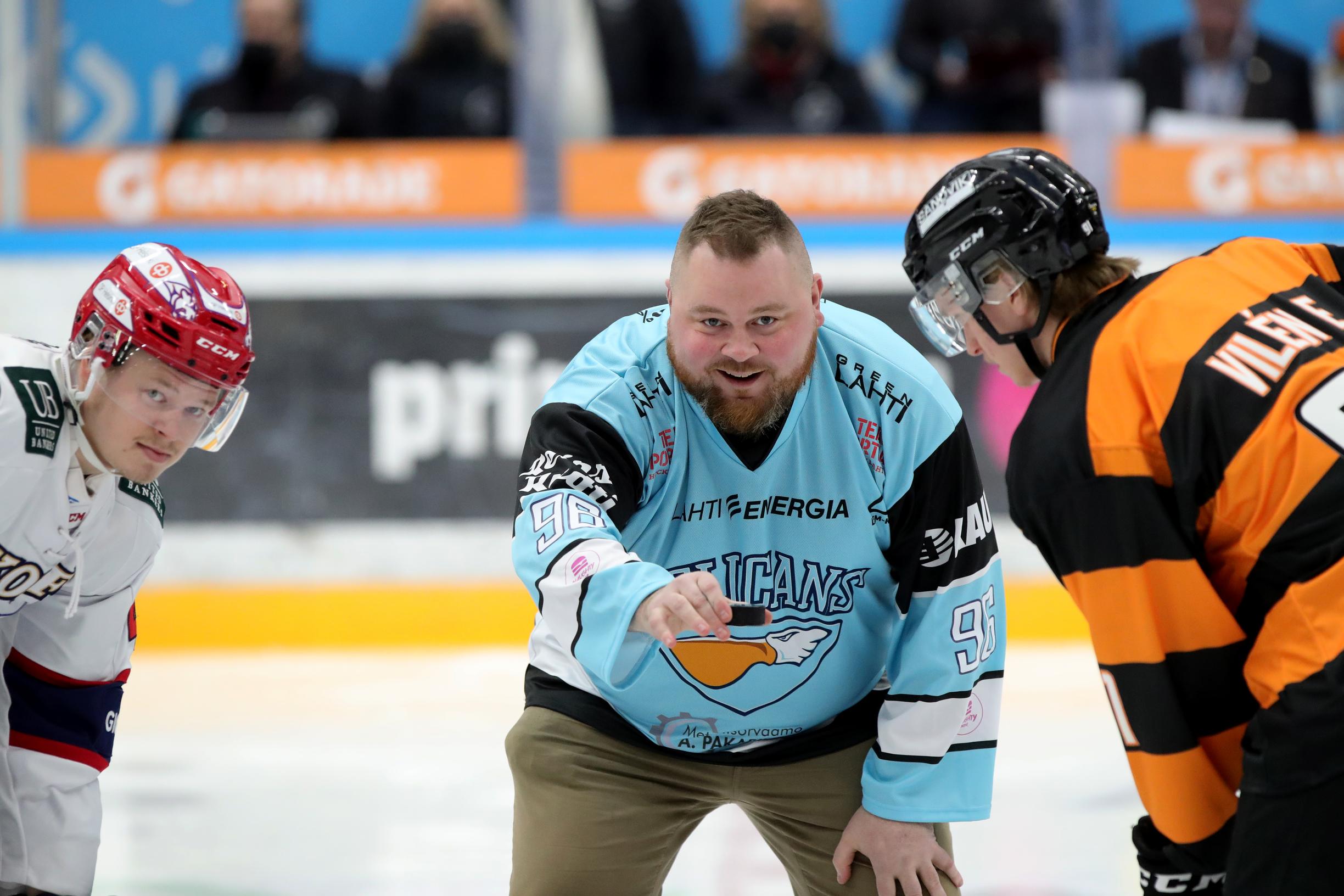Kuvassa Akseli Herlevi pudottaa avauskiekon Liigan Pelicans–HIFK-pelissä.