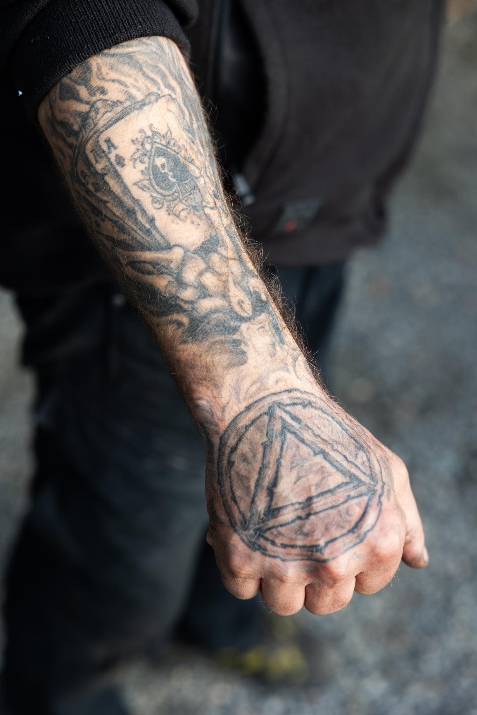 ”Kaatokädessä” on koko kämmenselän peittävä kolmio ympyrän sisällä, kansainvälisen Alcoholics Anonymous -yhteisön eli Nimettömien alkoholistien merkki. Toisen kyynärvarren sisäpuolelle on ikuistettu tyyneysrukous: Jumala suokoon minulle tyyneyttä hyväksyä asiat, joita en voi muuttaa, rohkeutta muuttaa, mitkä voin, ja viisautta erottaa nämä toisistaan.
