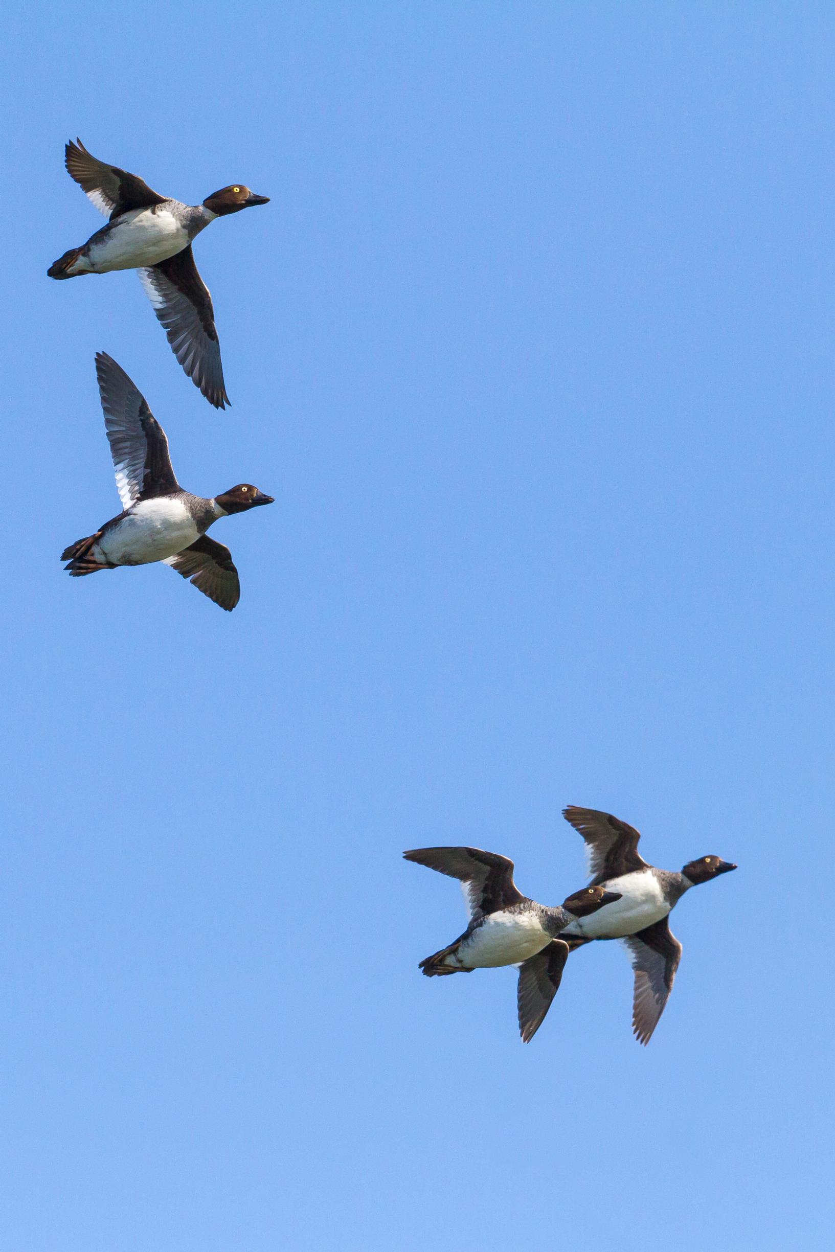 Ilmasta kuuluu siipien vihellys ja loiskahdus, kun telkkäpariskunta laskeutuu sulaan. Naaras on ruskeapäinen ja muutoin tummanharmaan ja valkoisen kirjava. Koiraan pää hohtaa vihreänä ja muu väritys on kirkkaan mustavalkoinen. Pariskunta ui vierekkäin. Molemmilla on kirkkaankeltaiset silmät ja koiraalla poskissaan valkoiset täplät.