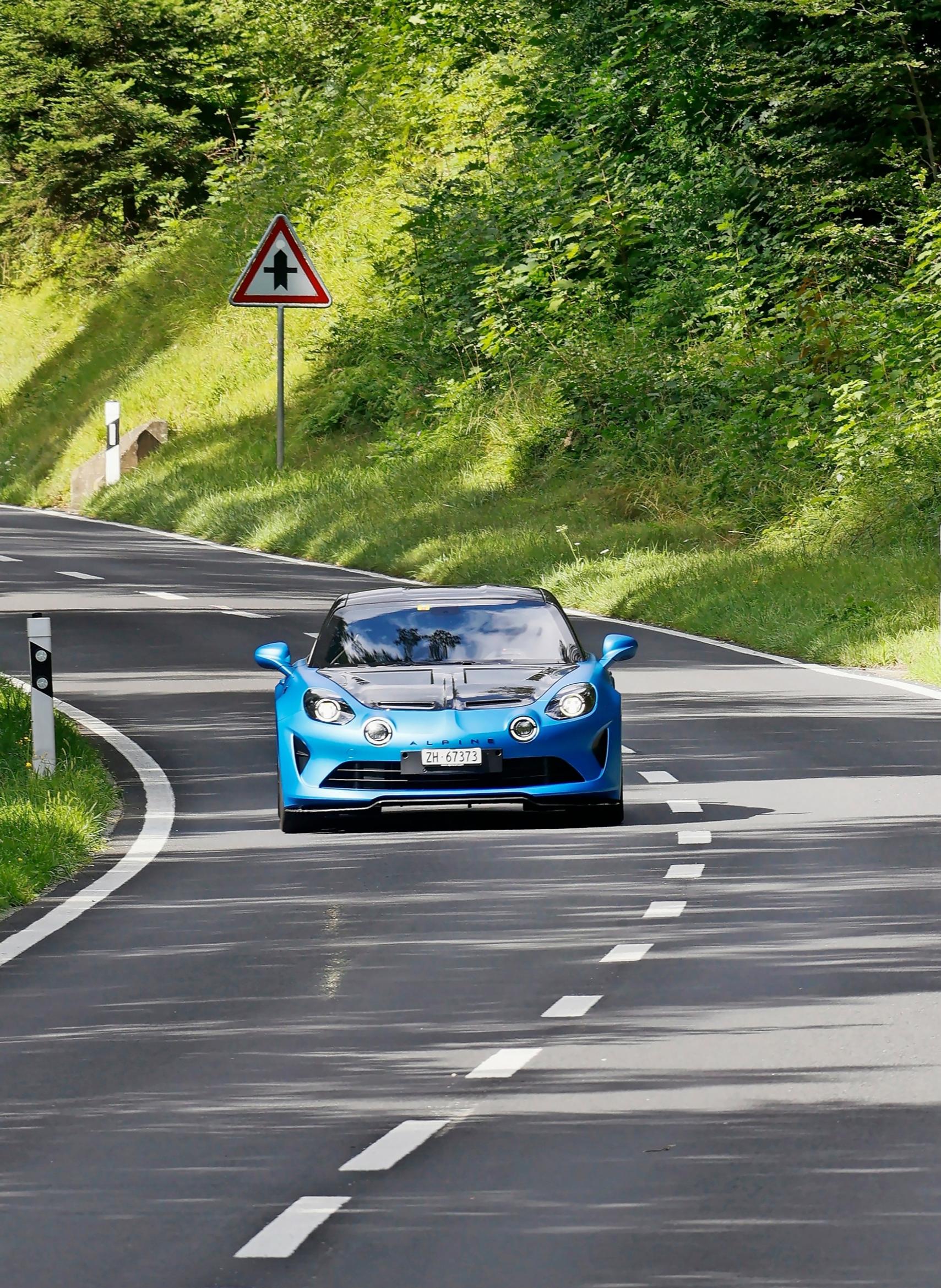 Niinpä. Kevyempänä kaikki on helpompaa. Ja kaikesta on siten helpompi nauttia. Autolla ajaminen tuntuu autolla ajamiselta. Ja Alpine A110 R:n alusta on lähes täydellinen. Vauhti kasvaa tien päällä nopeasti – ja vauhti myös tuntuu. Heikkopäällysteisillä mutkateillä kyyti on nopeasti sellaista, että etenkin matkustaja kokee olevansa huvipuistolaitteessa. Alpine on yksinkertaisesti uskollinen kilpa-auton DNA:lleen. Ohjaus ja suuntavakaus ansaitsevat molemmat huippuarvosanat – toisin kuin A110 S -sisaren kohdalla.