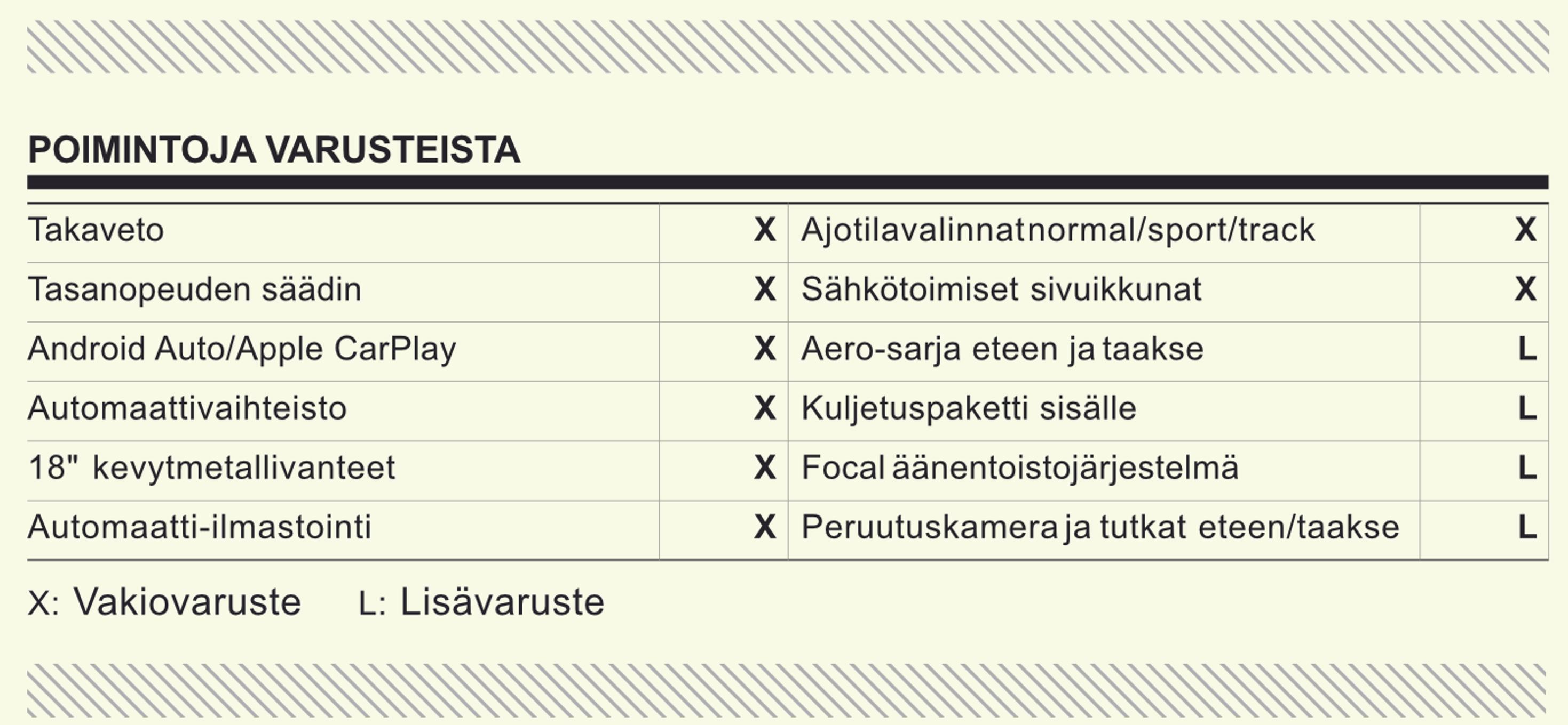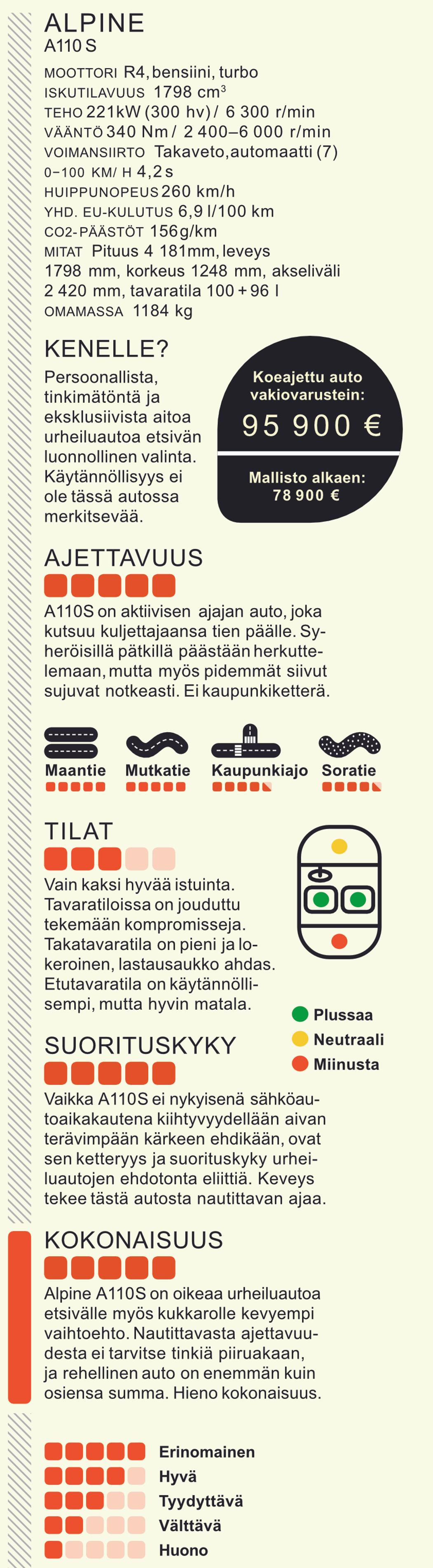 Suomen hinnastossa A110:stä on kolme eri versiota: perusmalli A110, A110 GT ja koeajomme A110 S. Autosta valmistetaan myös äärimmäisen urheilullista R Turini -versiota, mutta sitä ei Suomeen ole hinnoiteltu. Perusauton teho on jo lähtötasolla mukavat 185 kilowattia, eli 252 hevosvoimaa. Tällä miedoimmallakin versiolla kiihdytys nollasta sataan sujuu 4,5 sekunnissa ja huippunopeus on 250 km/h. Mainiosta suorituskyvystä huolimatta yhdistetty kulutus on alle seitsemän litraa sadalla. Siinäkin keveys on eduksi.