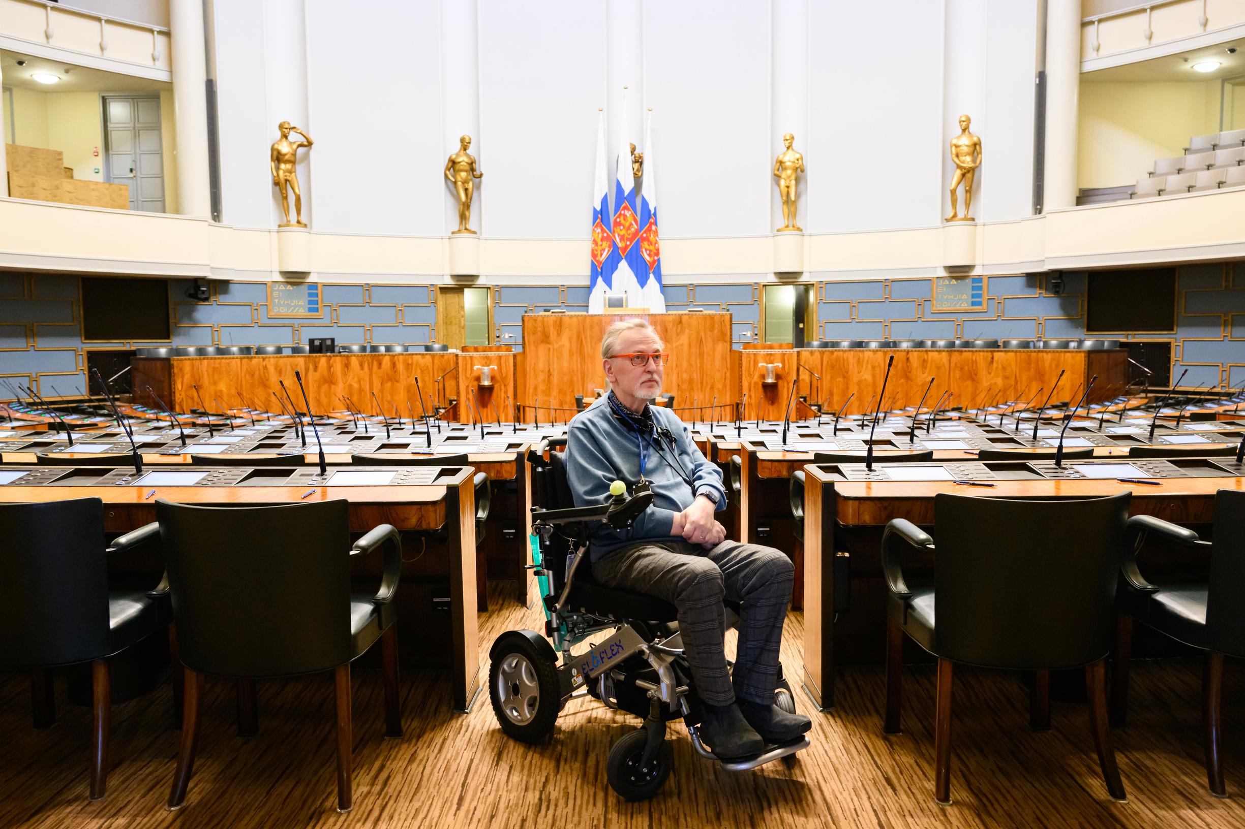 Antero Laukkasta naurattaa. Hän kertoo eduskunnan hankkineen hänelle uuden kulkupelin sen jälkeen, kun hän kaatui ja verilammikot uhkasivat graniittia.
