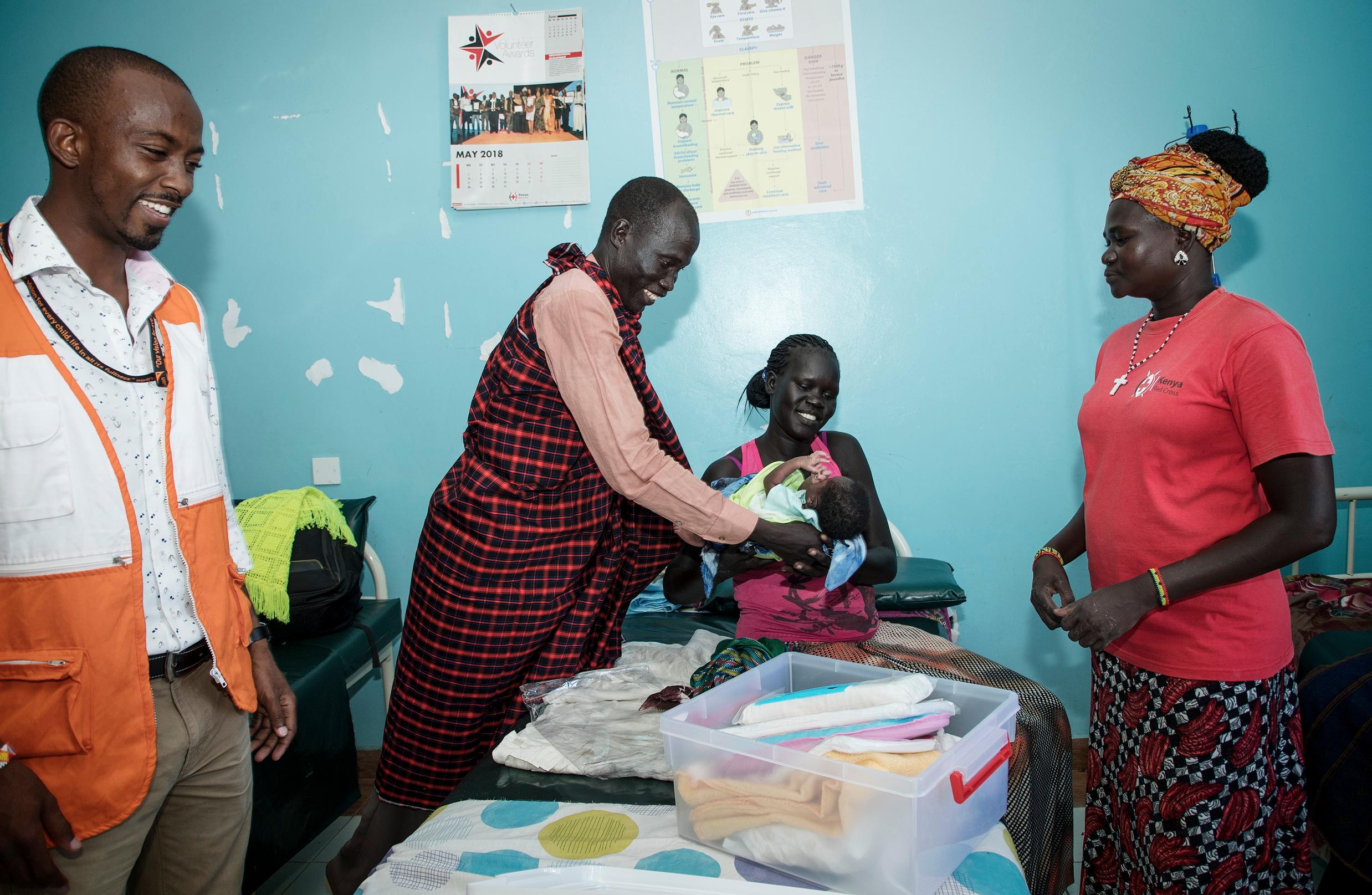 Mary Nasekelle luovutetaan äitiyspaketti. Nuori äiti on hieman hämillään, kun Pauline Kirwa purkaa koko pakkauksen sisällön sängylle.