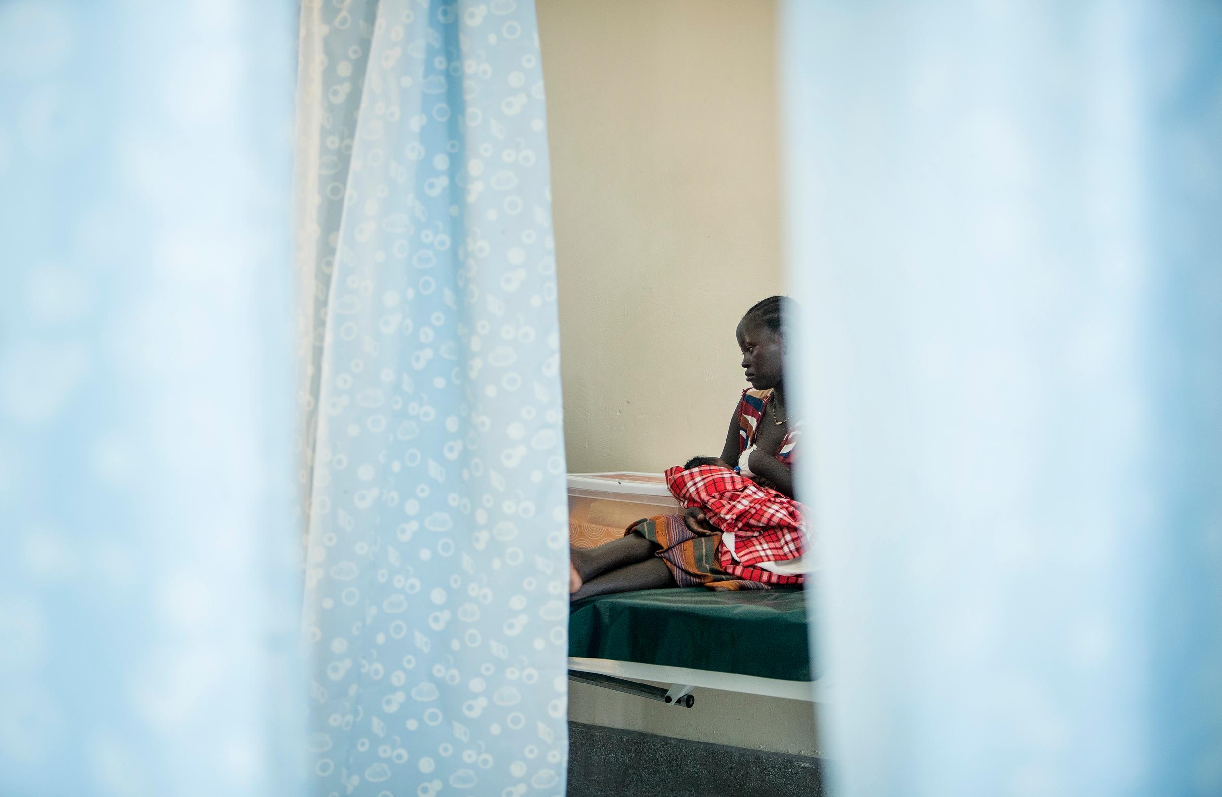Eteläsudanilaisen pakolaisen Selina Nakanin seitsemän kuukauden ikäinen tytär Gladys painaa vain viisi kiloa. Tyttö jaksaa hädin tuskin imeä ravintolisäliuosta.