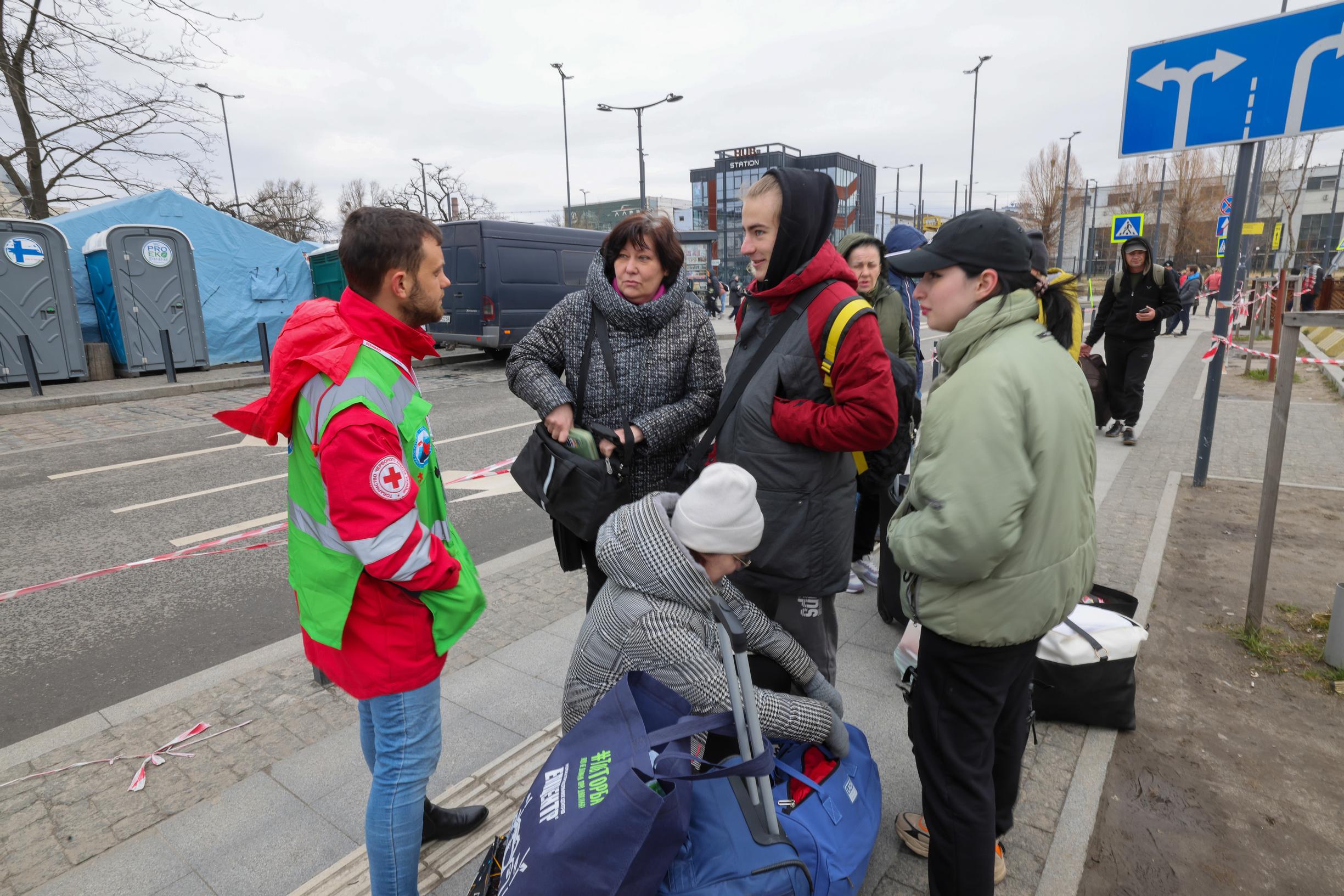Rautatieaseman edustalla pakolaisille aterioita tarjoavat ja tulijoita busseihin ohjaavat Ukrainan Punaisen Ristin vapaaehtoiset nuoret Sasha ja Alina ovat itsekin joutuneet lähtemään tänne sodan jaloista.