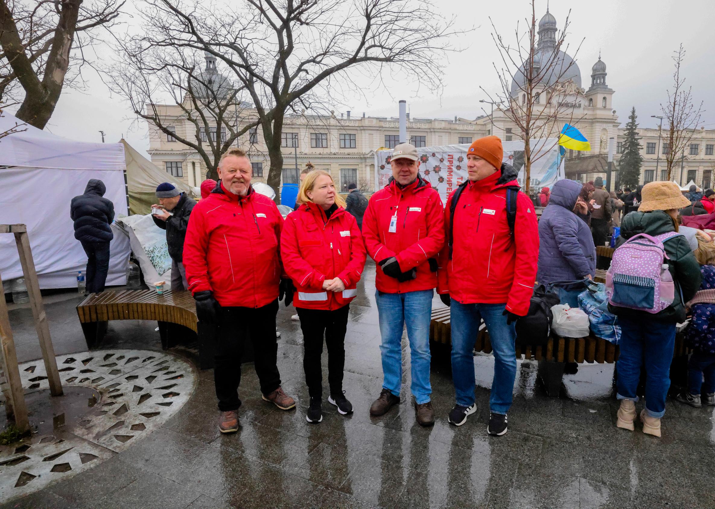 Punaisen Ristin logistiikan ja viestinnän auttajia Lvivin rautatieasemalla. Vasemmalta Tuomas Laibert, Caroline Haga, Keijo Eklöf ja Toni Laitinen.