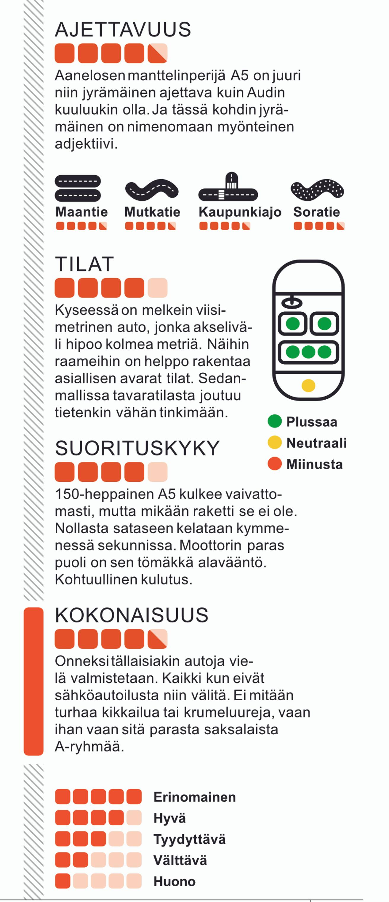 Jos haluaa eleettömän tyylikkään ja melko ison auton, niin tässä olisi. A5 taipuu moneen käyttöön. Tankki täyteen ja menoksi!