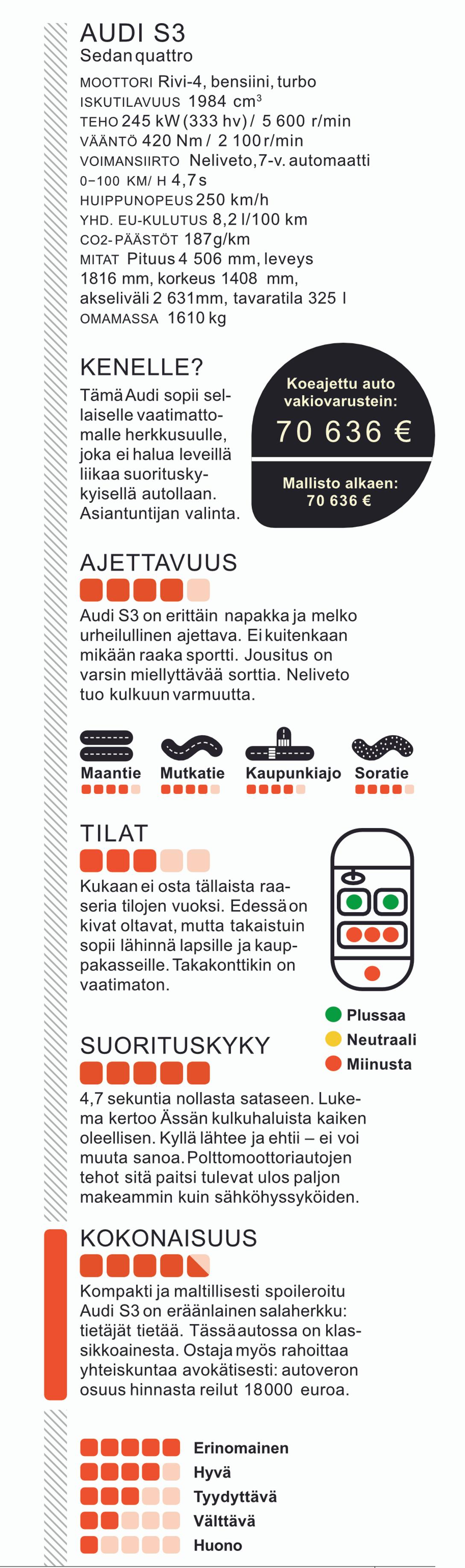 S3-Audissa on tiettyä sleeper-henkeä. Onhan siinä viemäreitä muistuttava putkinelikko takapäässä ja näyttävät vanteet, mutta muuten koristelu ei ole mitenkään yliampuvaa. Kun tässä on nyt päästy lämmittelykierrokselle, niin paljastettakoon pari numerotietoa. Tehoa turbokoneesta lähtee 333 hevosvoimaa, ja satasen vauhtiin päästään 4,7 sekunnissa. Ei huono – vai mitä? Jos ei halua räppäillä, niin tämä Audi lipuu arkiliikenteessä kuin mikä tahansa, huomattavasti laimeampi A3. Jousitus ei ole ollenkaan paukkukova.