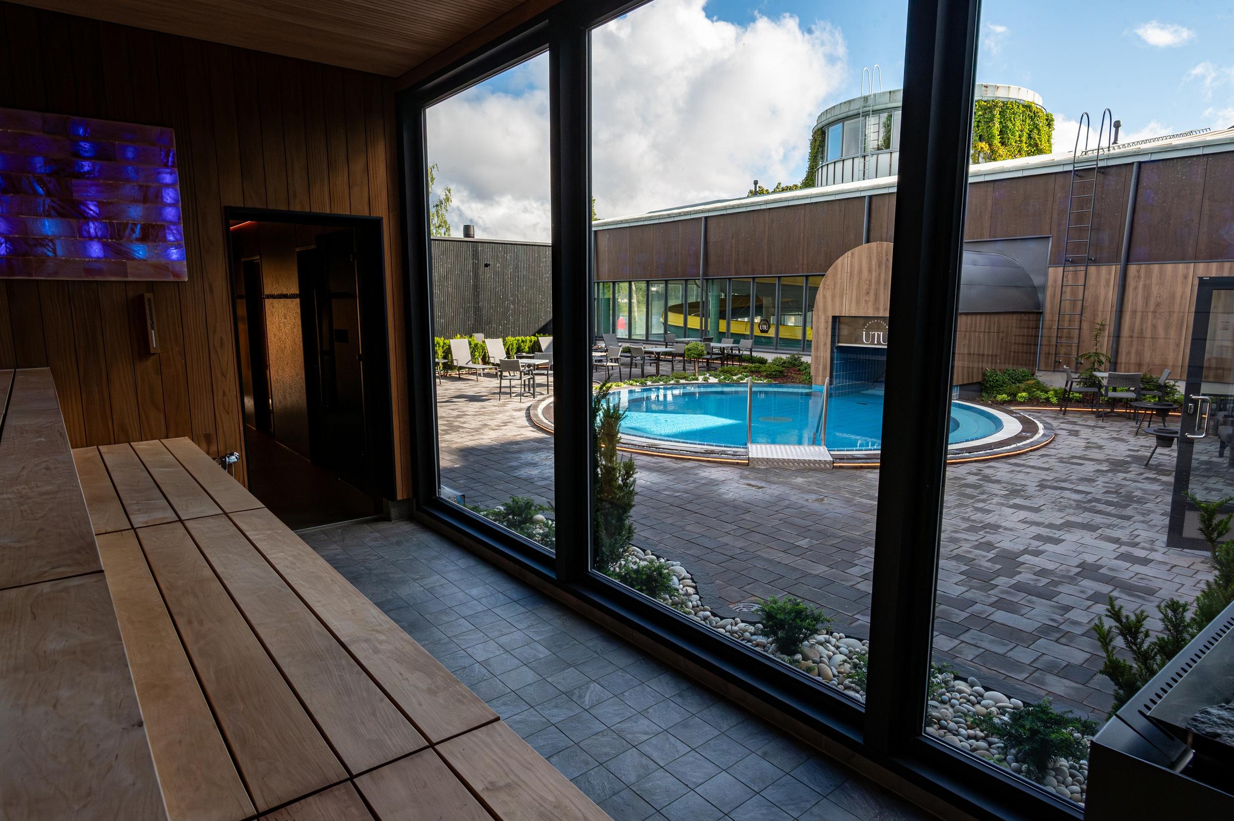 Samaa uuden ajan tasokasta tunnelmaa on myös saunamaailma Utussa. Kun kävelee alkuperäisen kylpylän puolelta sinne, tuntuu kuin hyppäisi 1990-luvulta 2020-luvulle. Turkoosit kaakelit ja porealtaat vaihtuvat tummiin puuseiniin ja höyryävään ulkoaltaaseen, joka tuo mieleen japanilaisen onsenin. On bambuseinäinen trooppinen sauna sekä suolasauna.