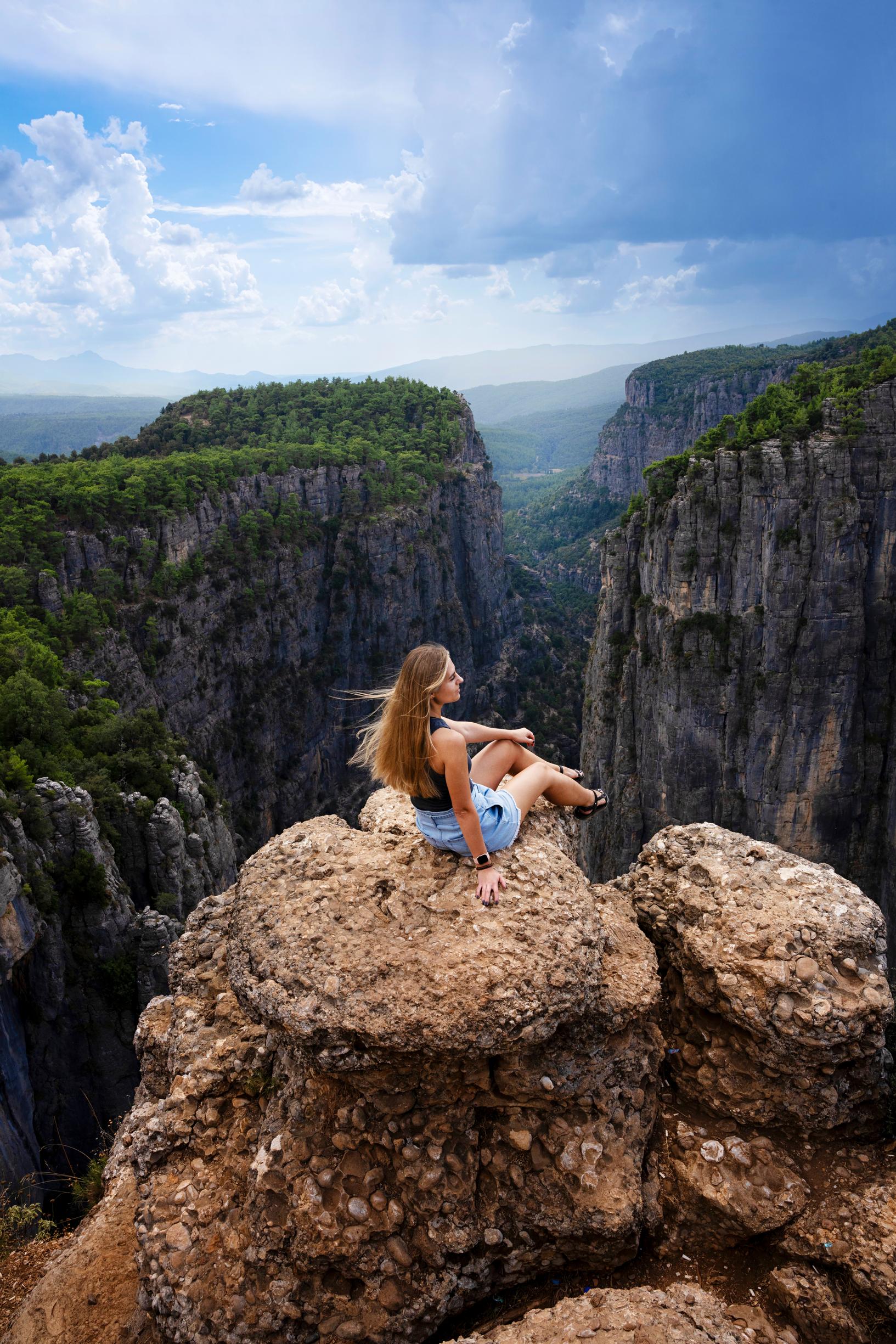 Perillä aukeaa huima näkymä. Kanjoni kulkee korkeiden, syvänharmaiden pystysuorien kiviseinämien lomassa. Kaiken yllä leijailee kotkia.