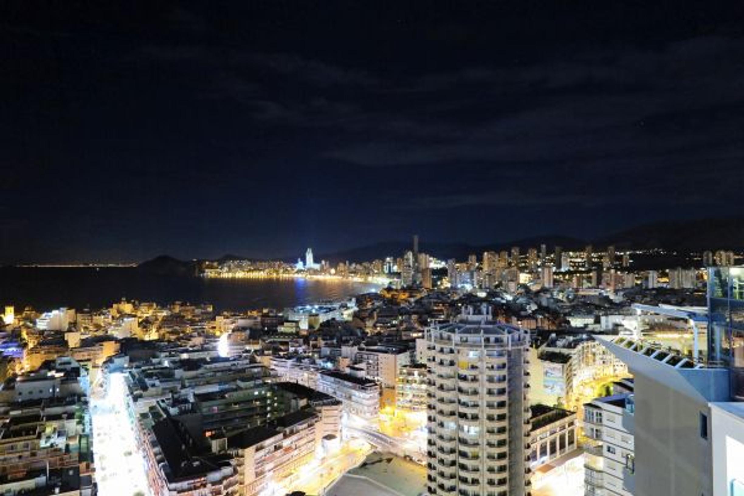 Kun aurinko on laskenut, Benidormin kaupungin valot hohtavat helminauhana lahden ympärillä.