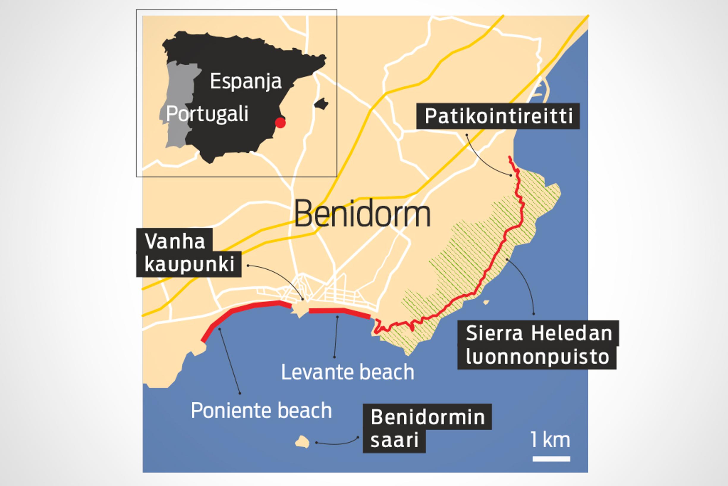 Benidormin kaupungin siluetin tunnistaa jo kaukaa. Pyöreää lahdenpoukamaa reunustavat pilvenpiirtäjät, 1950-luvulla rakennetut retrotornit ja modernit luksusrakennukset.