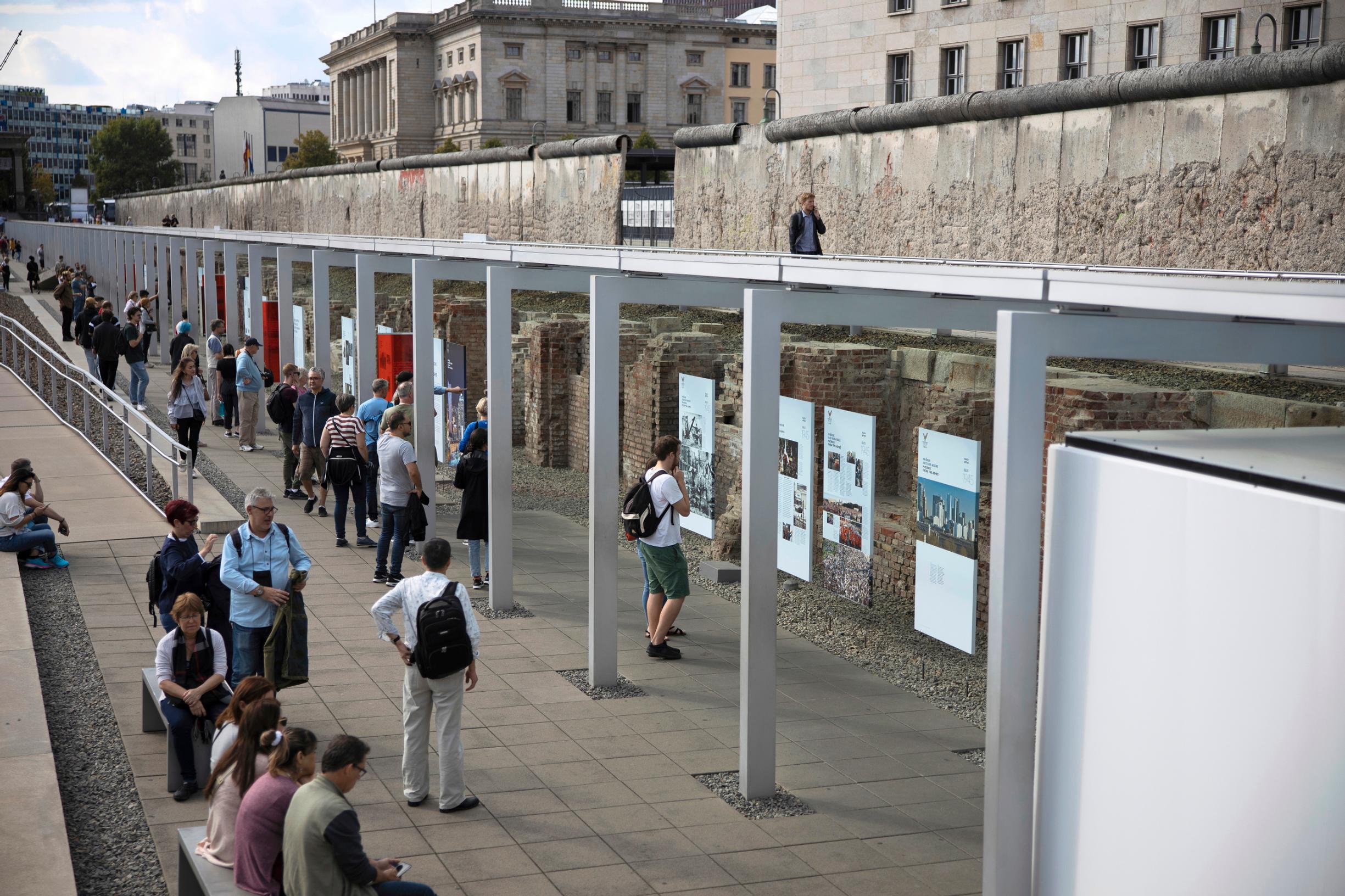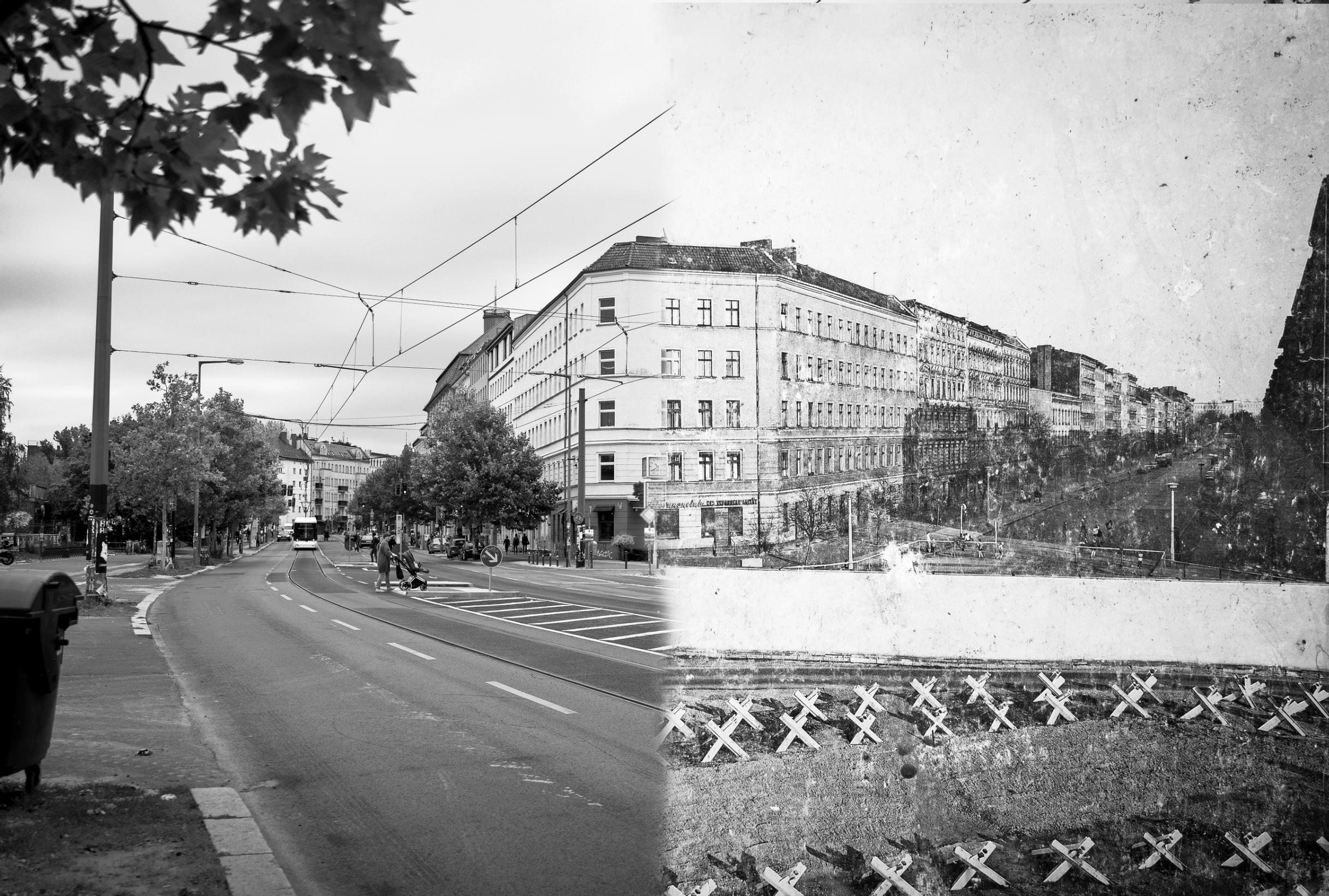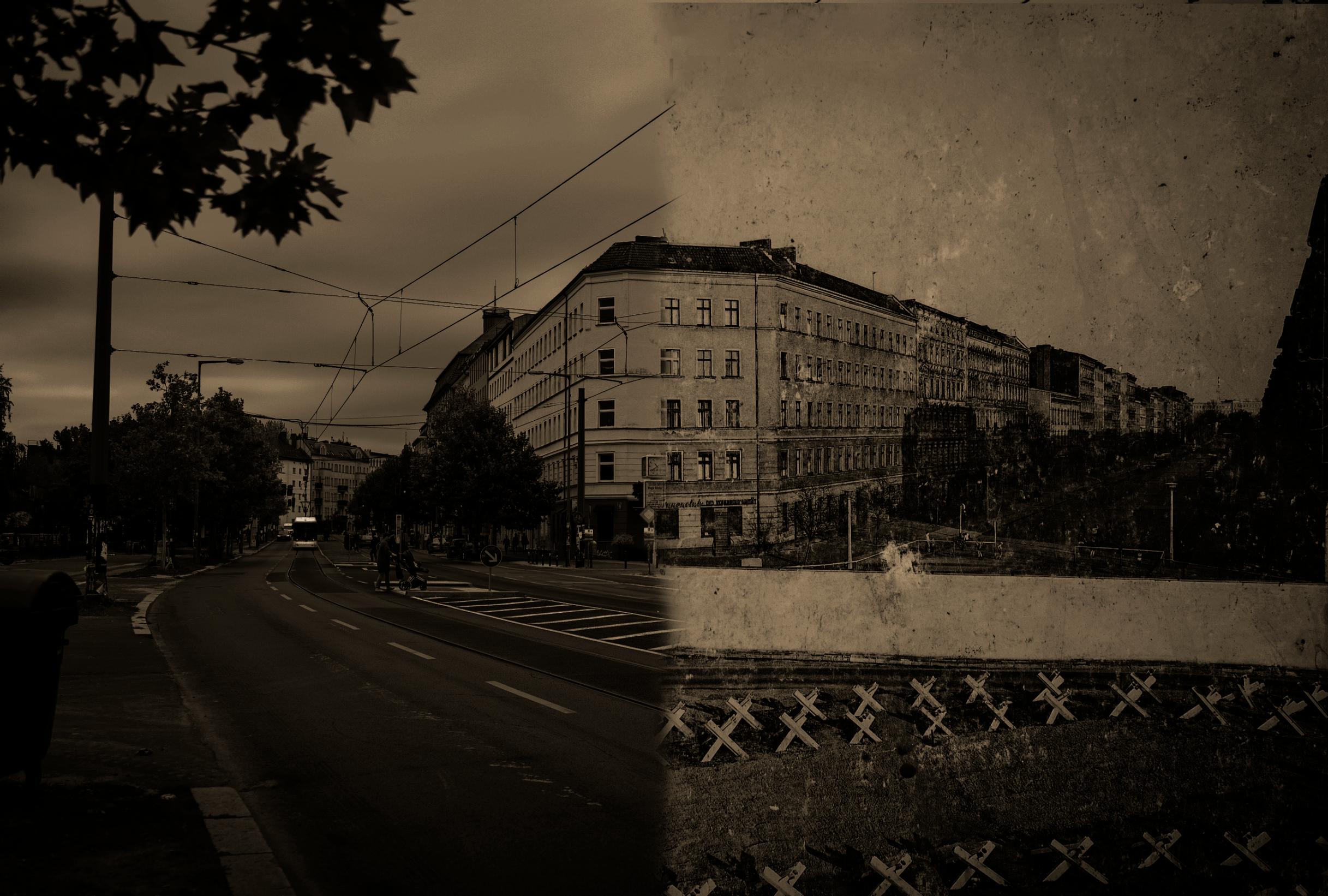 Jalkojen alla kulkee kaksoiskuvio merkiksi siitä, missä muuri oli. Sama kivinen kerrostalo, joka seisoo tuskin 50 metrin päässä, oli vuoteen 1989 asti rautaesiripun takana, osa Itä-Berliiniä ja DDR:ää.