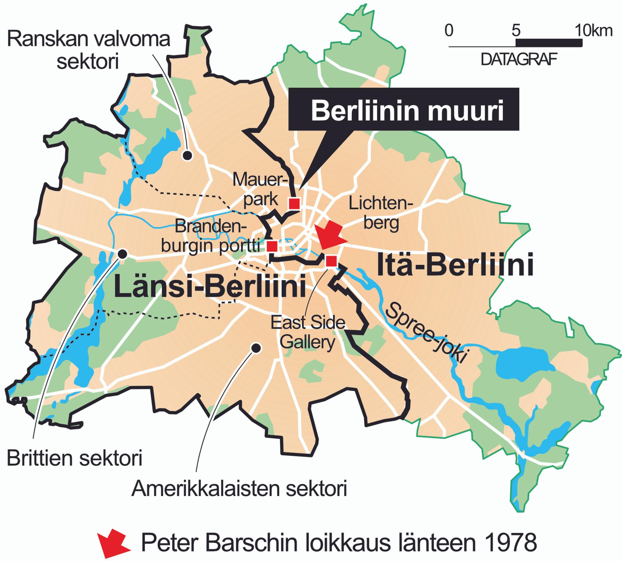 - Itä- ja Länsi-Berliinin välillä oli muutamia rajanylityspaikkoja, joista ulkomaiset turistit saivat käyttää Checkpoint Charlieta ja Friedrichstrassen metroasemaa. Itäsaksalaisilla ei ollut oikeutta ylittää rajaa ilman erityistä lupaa.