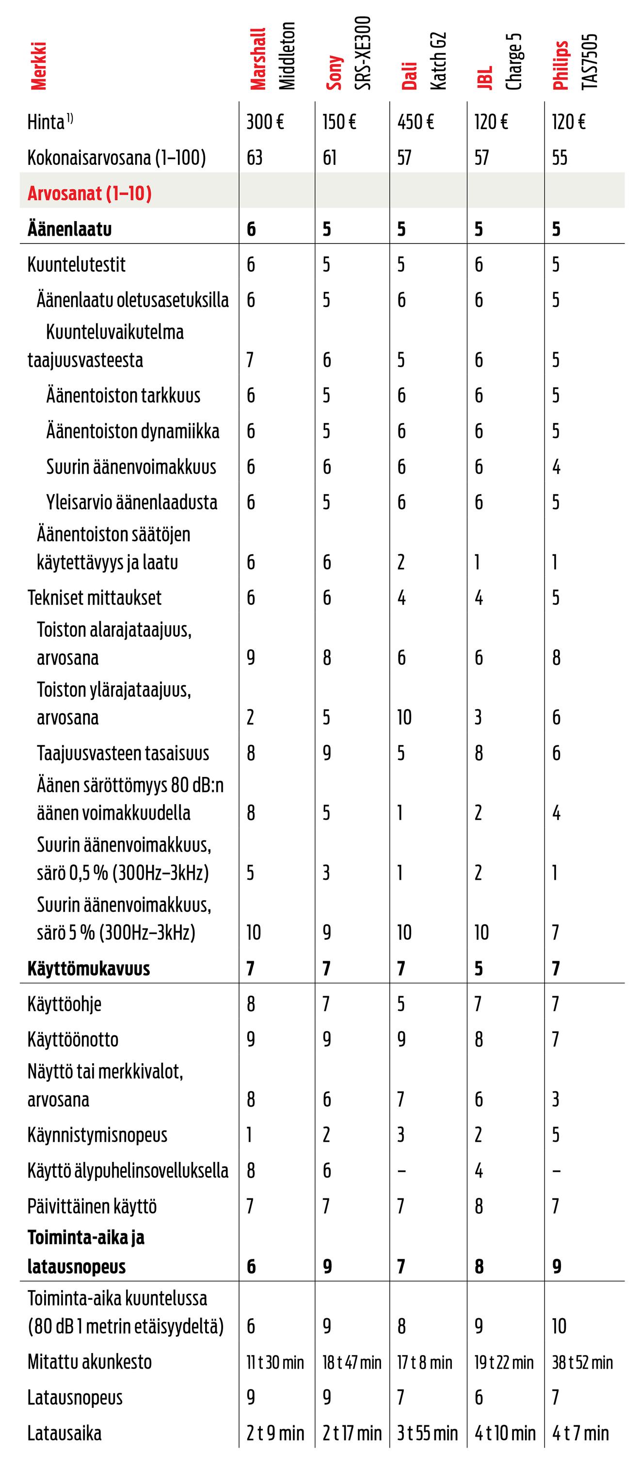 Taulukkoon valittujen kaiuttimien äänenlaatua arvioitiin sekä kuuntelutesteissä että teknisissä testeissä. Kuuntelutesteissä hyvään arvosanaan ylsi testivoittajan eli Marshall Middletonin lisäksi JBL Charge 5.