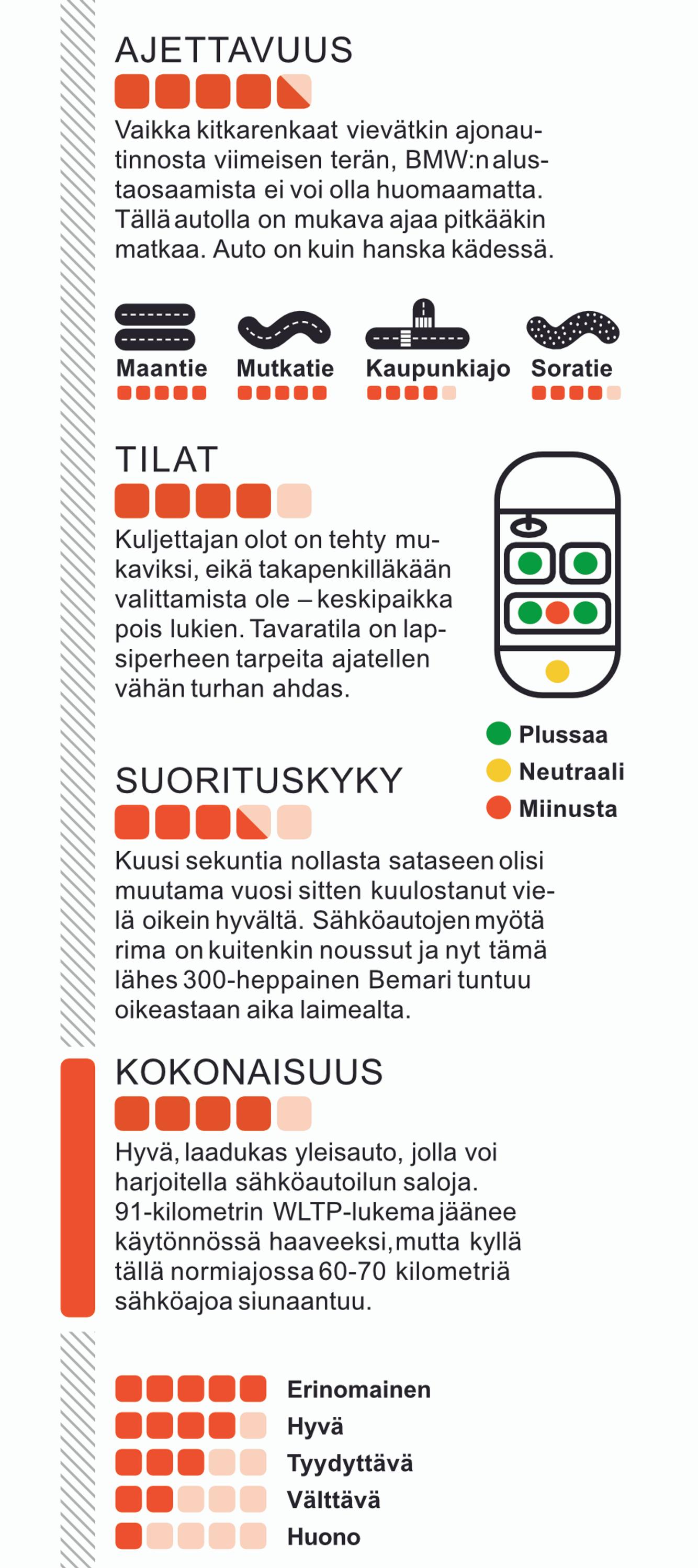 Nyt koeajamme auto oli nelivetoinen ja farmarikorinen lataushybridi, jonka merkittävin päivitys on entistä isompi ajoakku. Se on nyt nettoenergiasisällöltään 19,5-kilowattituntinen, ja BMW lupailee sille optimioloissa ja kevyellä kaasujalalla jopa 91 kilometrin sähköistä toimintamatkaa.