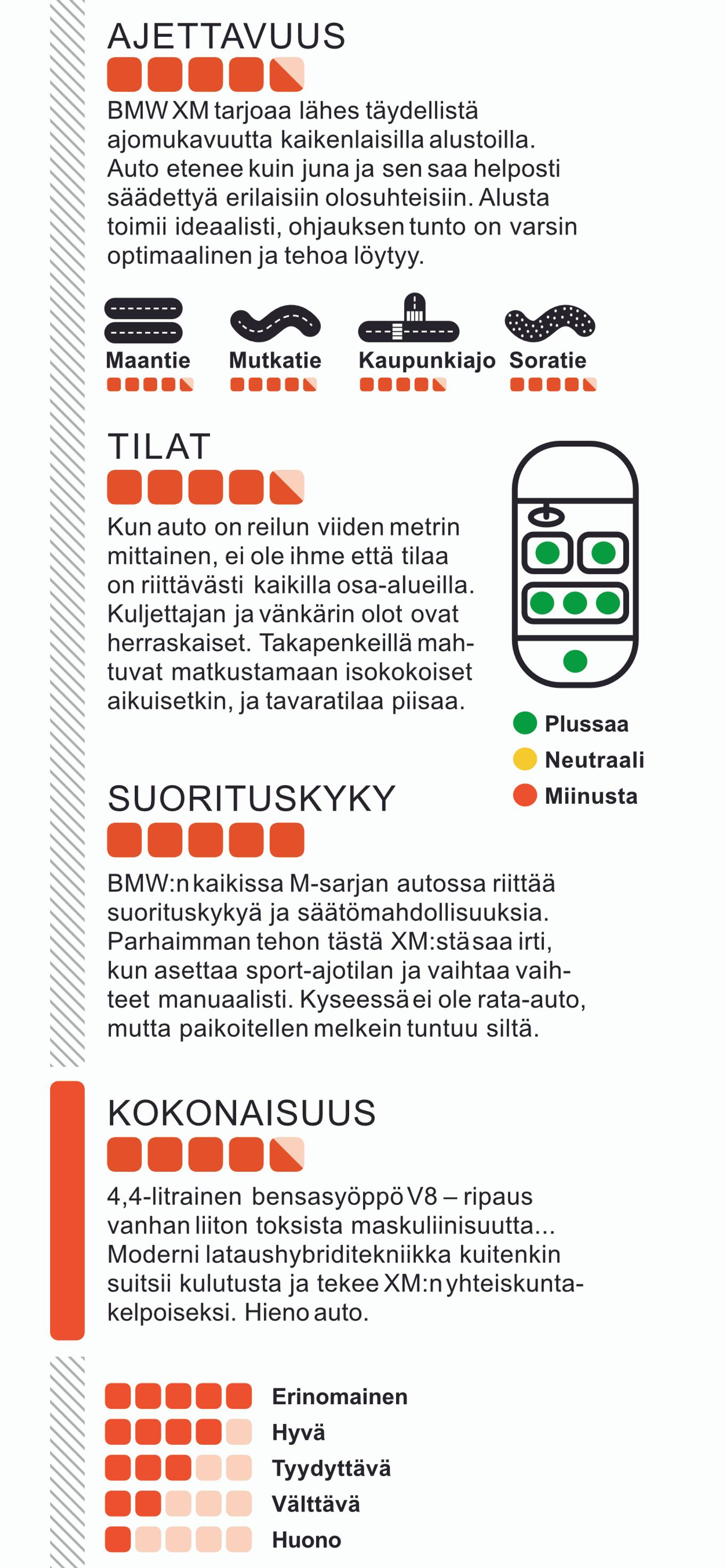 BMW XM:stä löytyy vaativallekin kuluttajalle kaikki mahdollinen. Hinta on toki hyvin suolainen, sillä koeajoauton hintalapussa luki 191 568,79 euroa. Jos omaa tällaisen summan autorahaa, niin XM on hintaluokassaan erinomainen peli.