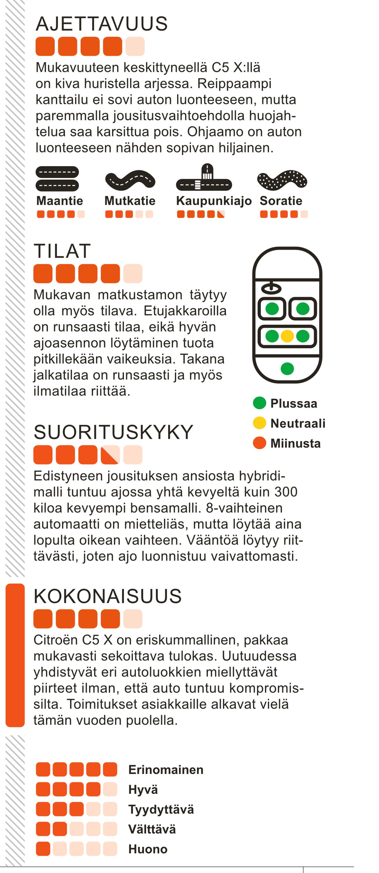 Sähköistä toimintamatkaa luvataan reilut 50 kilometriä, jonka pitäisi riittää lyhyisiin kaupunkiajoihin. Mukavuus on toiminut Citroënin myyntivalttina jo pitkään, eikä C5 X:n kohdalla tilanne ole erilainen. Tyynymäinen alusta ottaa epätasaisuudet ja hidasteet hyvin vastaan, mutta tiukoissa mutkissa korin kallistuminen jopa ärsyttää.