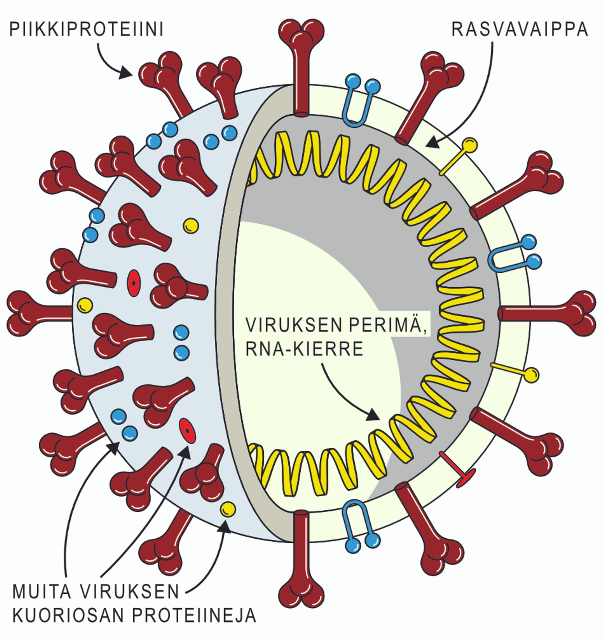 Viruksella on kolme osaa: lipidi- eli rasvavaippa, siihen kiinnittyneitä ulos- ja sisäänpäin kurkottavia proteiineja ja sisällä perimä.