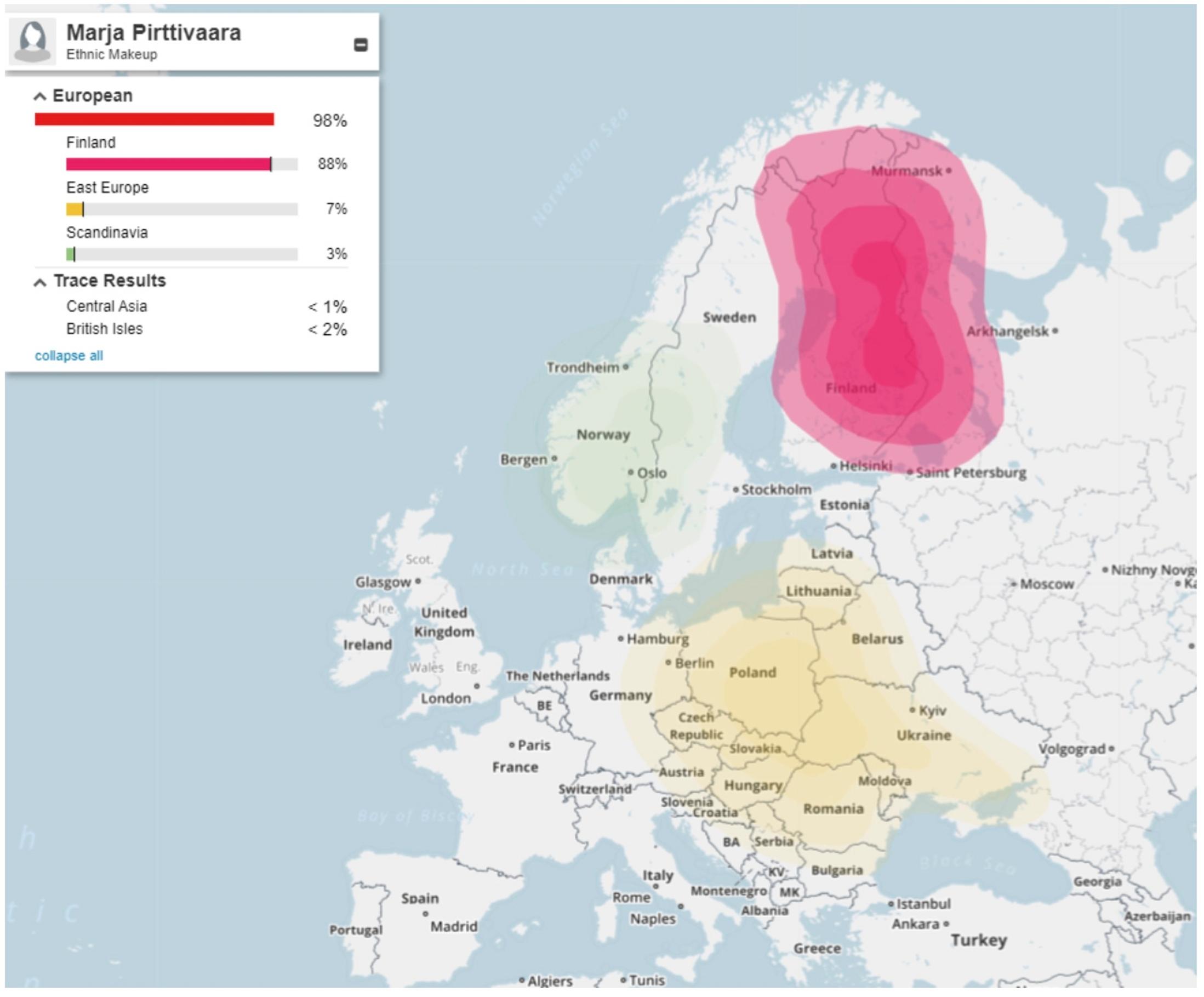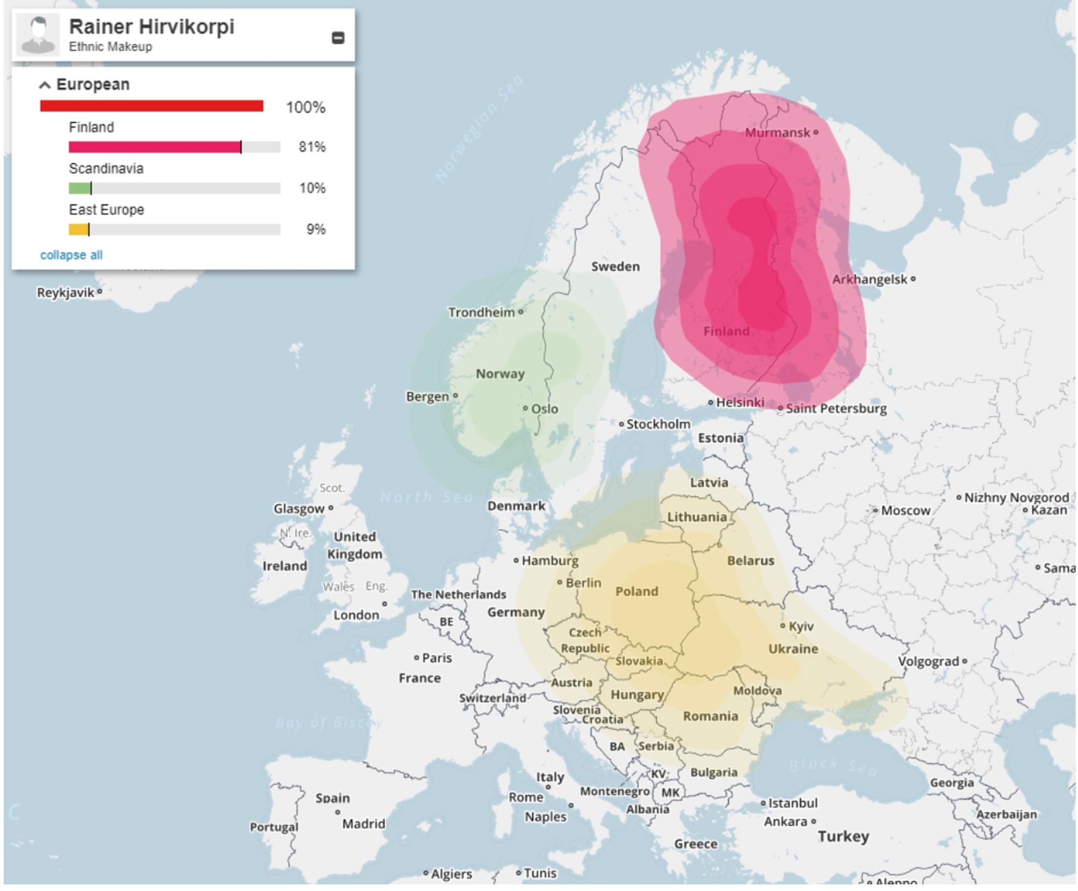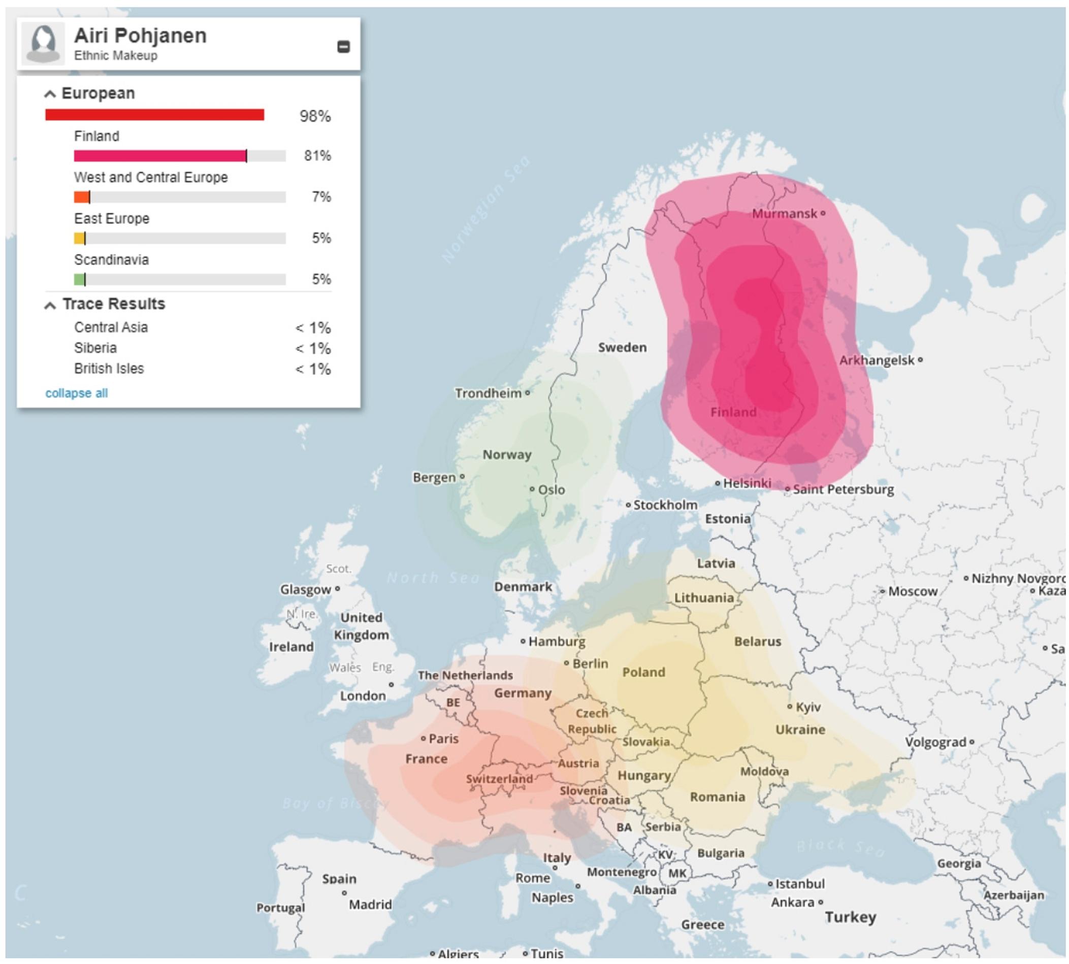 Loppu tulee sitten Baltian ja Itä-Euroopan suunnalta ja Skandinaviasta. Etnisyysanalyysituloksissani näkyy myös häivähdyksiä eksoottisista etnisyyksistä, esimerkiksi Amerikan tai Papuan alkuperäisväestöstä.
