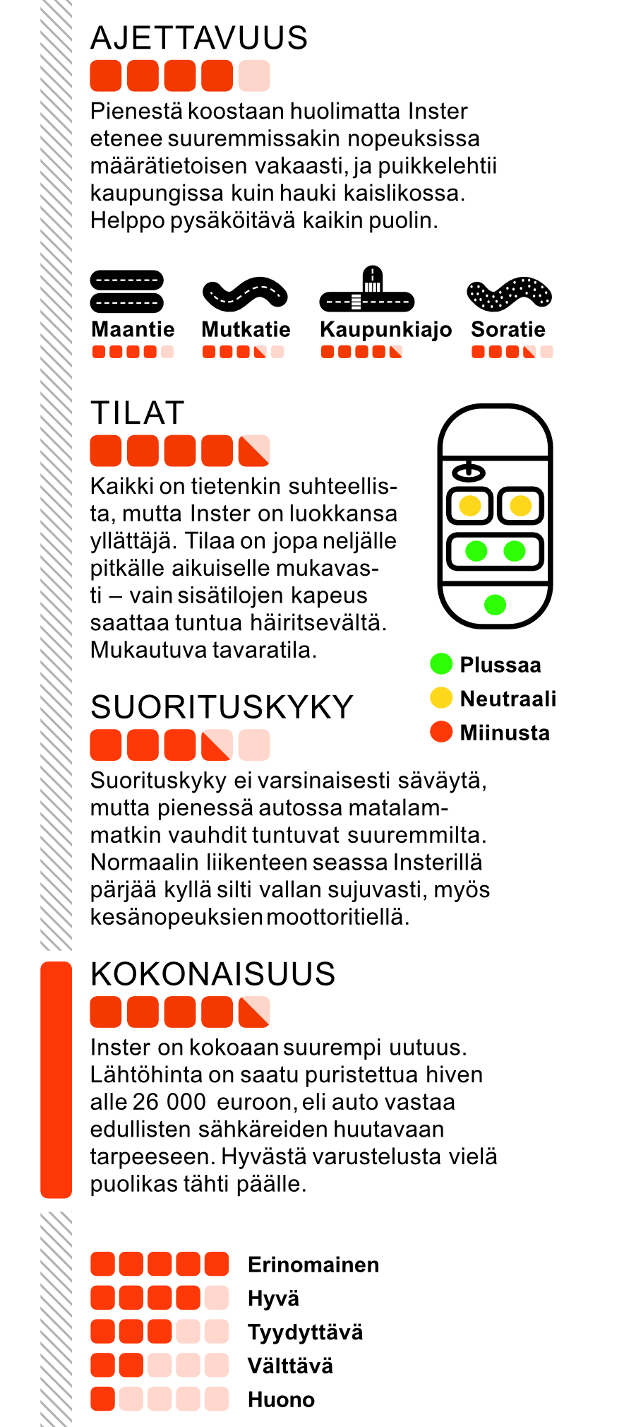 Insteristä on ulos hyvä näkyvyys, ja molemmilla istuinriveillä on tilaa kapeudesta huolimatta yllättävän paljon. Auton ajotilat ovat eco, normal, sport ja snow. Ohjaustuntuma on hieman hontelo ja tunnotonkin, mutta silti korkeahko Inster seuraa toivottua ajolinjaa uskollisen vakaasti. Lattiaan sijoitettu akku auttaa vakauden ylläpidossa, eikä auto ei kallistele juurikaan. Jousitus on topakaksi säädetty, mutta tarjoaa onneksi myös anteeksiantavaa letkeyttä, mikä lisää matkustusmukavuutta. Inster on kohtuullisen hiljainen myös moottoritienopeuksissa, eikä juurikaan vaadi paimentamista pitkillä suorilla.